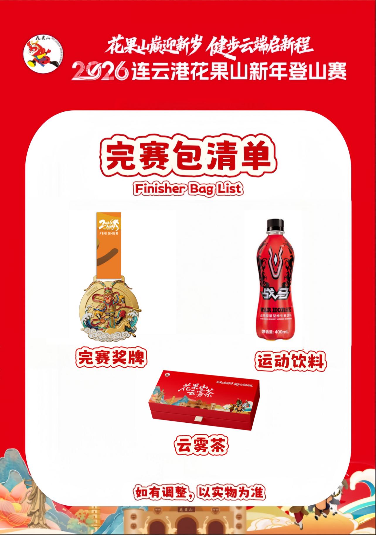 内含:完赛纪念奖牌、花果山云雾茶、运动饮料。(如有调整,以实物为准)