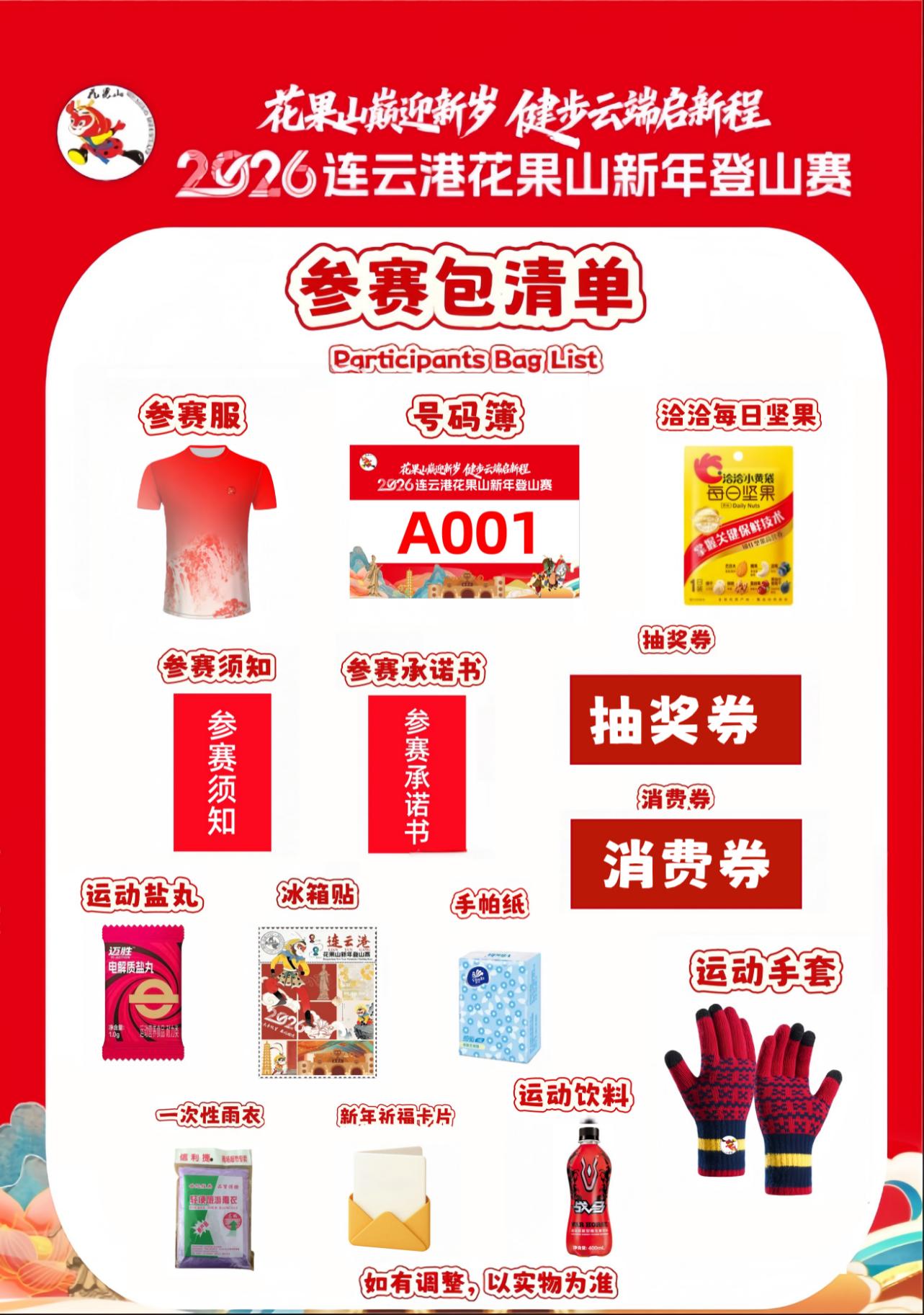 内含:参赛服、计时号码簿、一次性雨衣、运动手套、运动饮料、冰箱贴、文旅消费优惠券、抽奖券、新年祈福卡、参赛须知、参赛承诺书、每日坚果、运动盐丸、手帕纸。(如有调整,以实物为准)