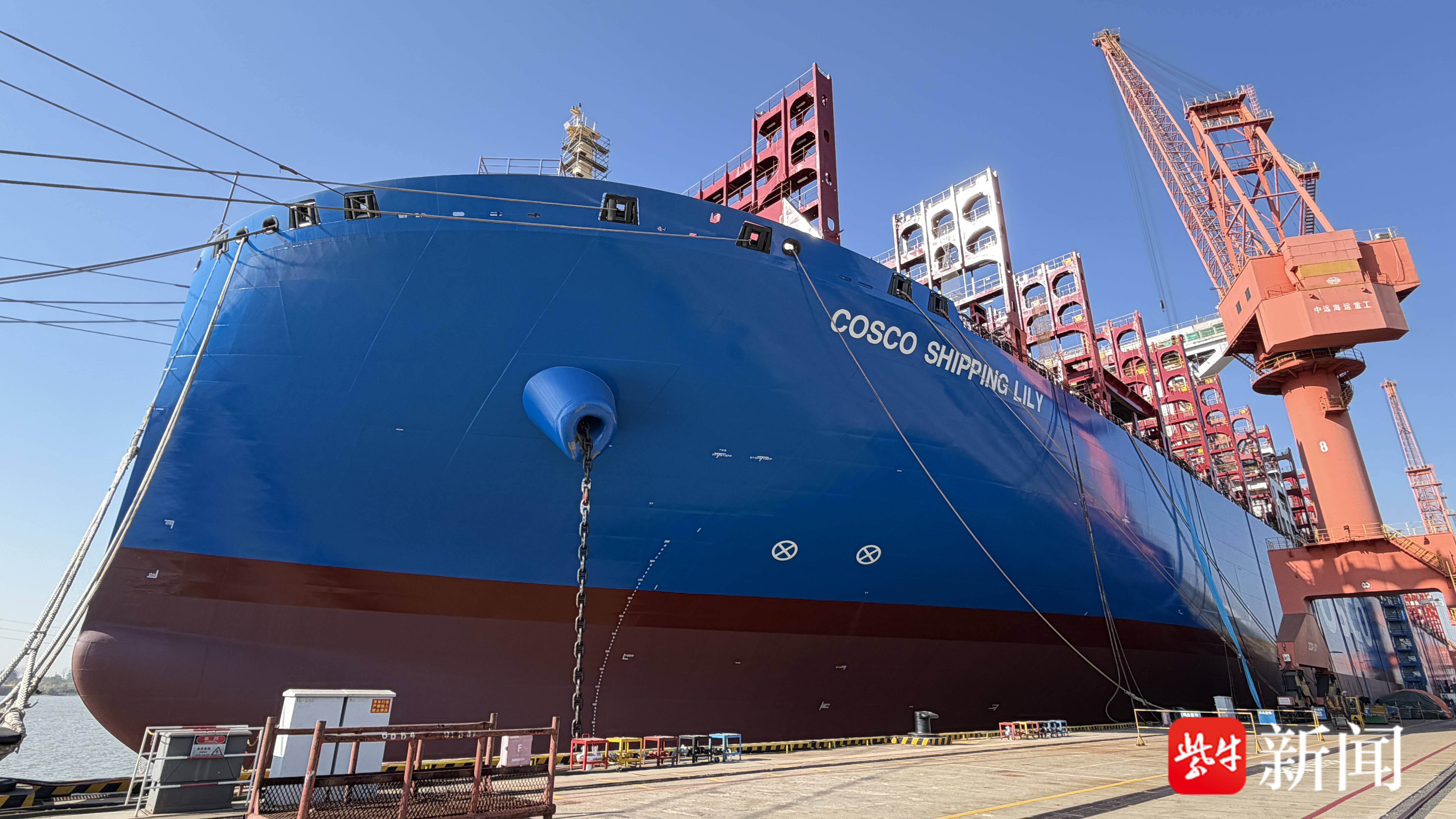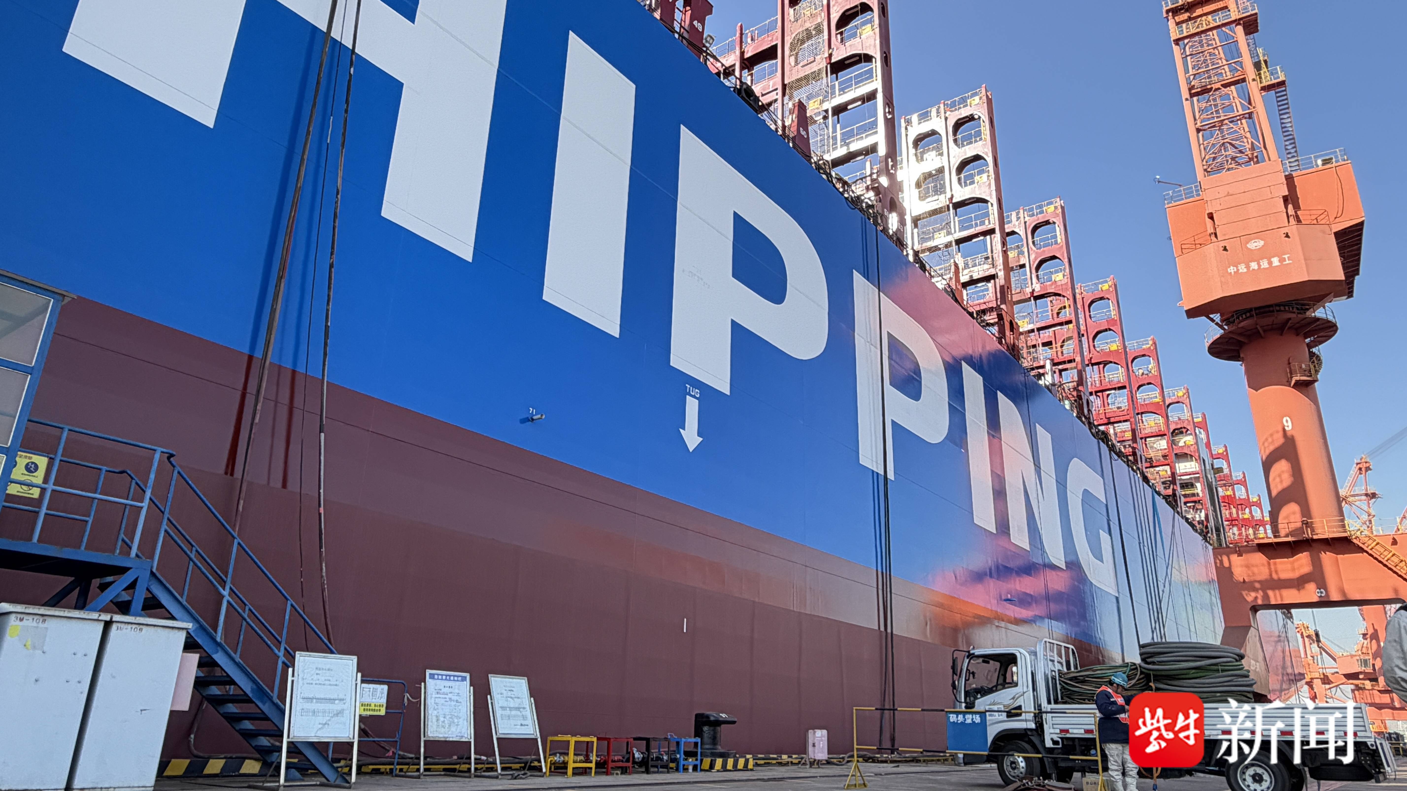 告别繁忙的船闸,媒体团沿江而下,来到“中国船舶之城”扬州。在扬州中远海运重工的船坞旁,庞然巨物令人震撼。一艘总长366米、型宽51米的“巨无霸”已近完工,它是国内首制16000箱甲醇双燃料集装箱船。