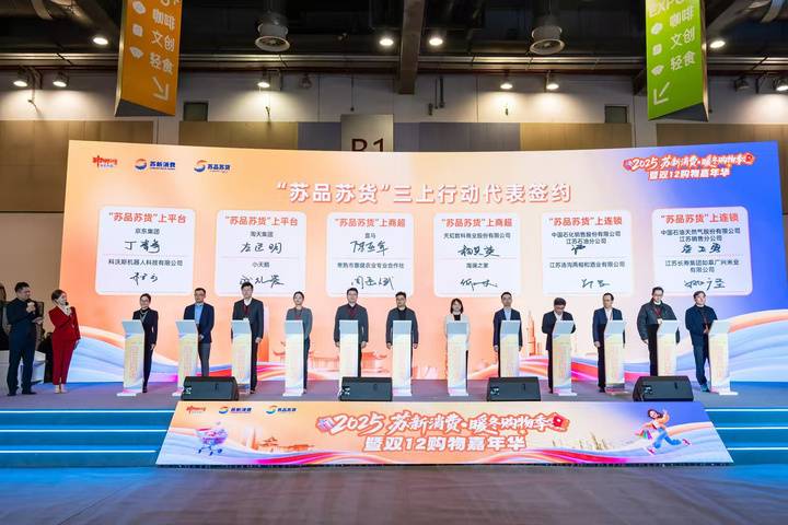 京东、淘天等平台代表,盒马、天虹等商超代表,中国石化、中国石油等连锁企业代表,分别和科沃斯、小天鹅、常熟惠健合作社、海澜之家、江苏汤沟、江苏长寿集团等苏品苏货代表企业签约,推动苏品苏货走进千家万户,行销全国市场。