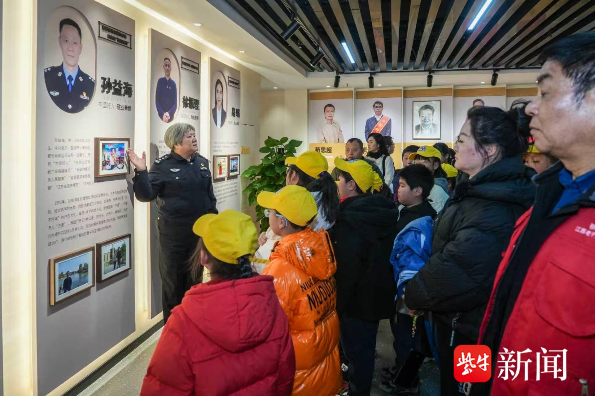 江苏省巾帼党课讲师、盐城市公安局亭湖分局关工委副主任刘婵指着展板讲述“中国好人”张红霞、孙益海等公安民警忠诚担当、无私奉献的为民故事,勉励青少年扣好人生第一粒扣子,争做新时代江苏好少年。