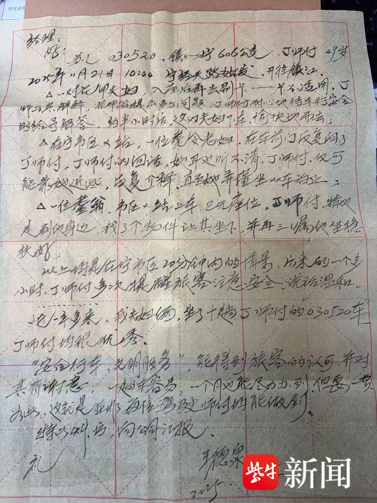 “一趟车容易,一个月也能尽力办到,但要一贯为此,并非每位驾驶员都能做到。”信中,王德泉夫妇感慨道,一年来他们乘坐丁师傅的车已有十次,次次感受如沐春风。为表达这份认可,王德泉辗转多次,通过12345热线问得江天公交热线电话最终得到地址,将感谢信寄至公司。