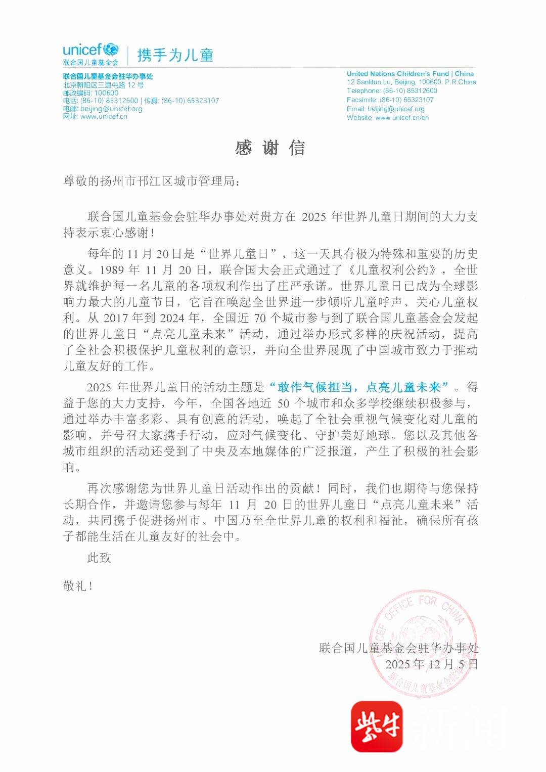 扬子晚报网12月10日讯(通讯员 郭晨 记者 陈咏)记者10日从扬州获悉,联合国儿童基金会驻华办事处近日向扬州市邗江区城市管理局和扬州市邗江区垃圾分类示范教育基地,分别寄来一封感谢信,感谢他们在2025年11月20日“世界儿童日”当天,积极高效参与“敢做气候担当 点亮儿童未来”主题庆祝活动。两封“沉甸甸”的感谢信,是认同、赞誉和荣耀,更是责任和担当。