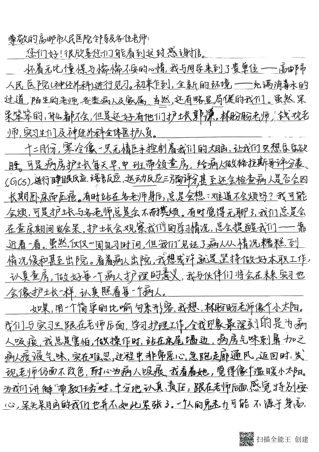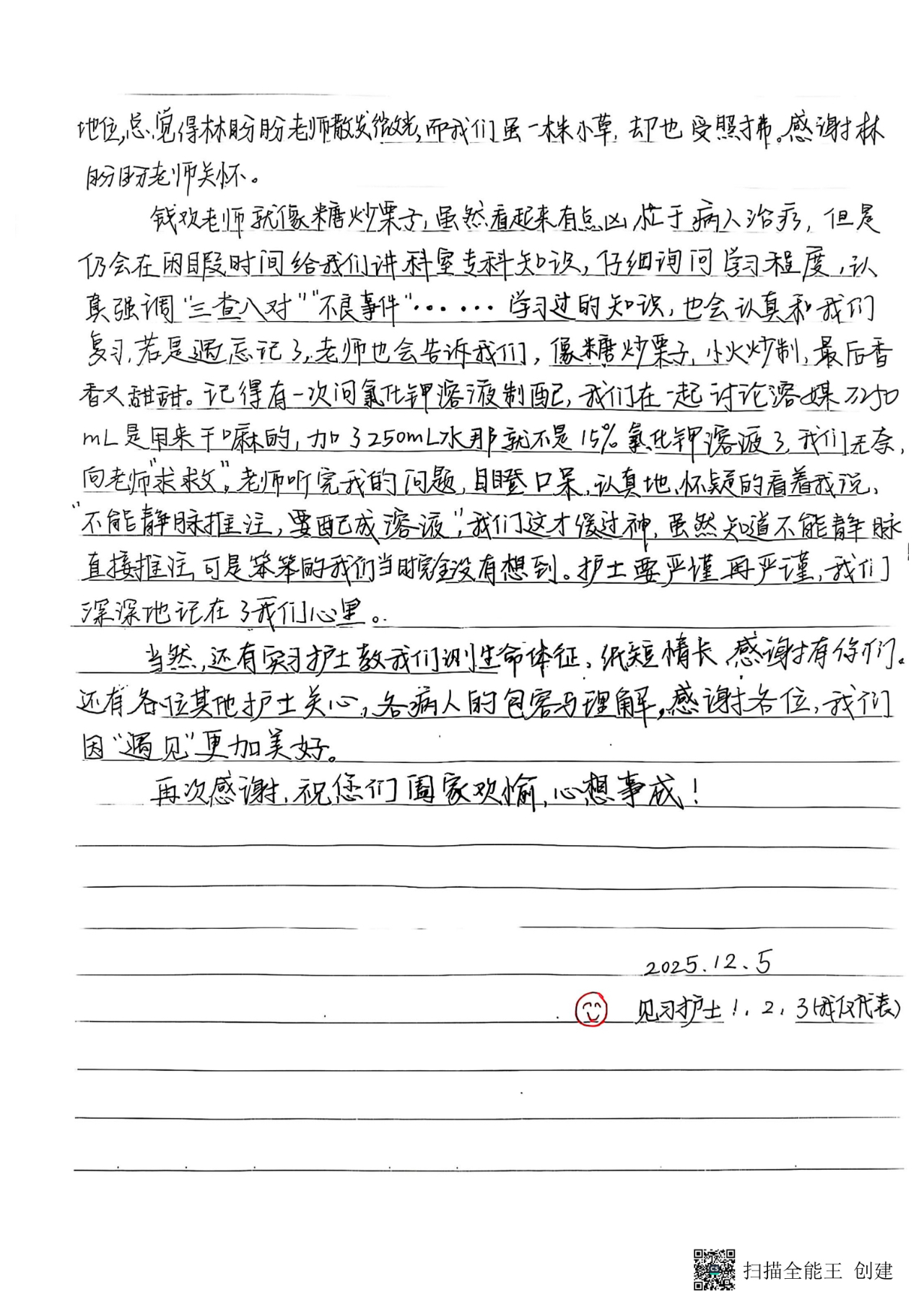 信中写道,初入临床,面对陌生的环境与工作,同学们内心充满忐忑,然而,神经外科老师们以极大的耐心和专业的素养,为他们点亮了前行之路。郭谦护士长每日带领查房,细致完成GCS评分、各项风险评估及预防并发症等护理工作指导,其一丝不苟、严谨认真的工作态度,让同学们深刻体会到护理工作的意义与坚持的价值。同学们动情地表示:“看着病人好转出院,或许就是认真做好每项护理的意义所在。”同学们将林盼盼老师比作“小太阳”。在面对吸痰操作时,林老师沉着冷静、专业规范的表现,以及在她身边学习时感受到的安心与鼓励,驱散了同学们的紧张与畏惧。钱欢老师则被形容为“糖炒栗子”,虽然表面严肃、工作繁忙,却总在忙碌间隙为同学们讲解专科知识,反复强调“三查八对”等核心制度,以严格的要求和细致的讲解,帮助同学们夯实基础、纠正错误,其“小火慢炖”般的带教让同学们受益匪浅。