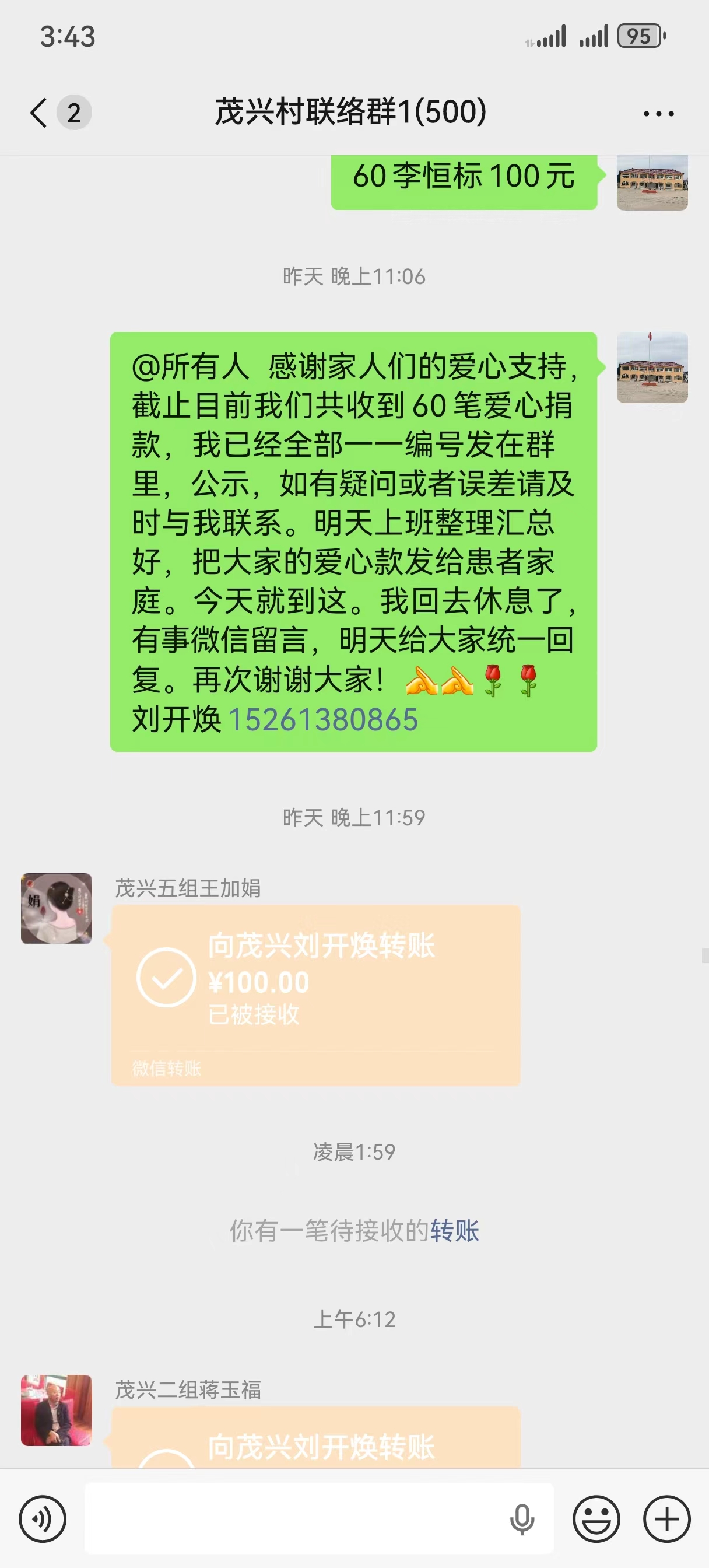 “不能让这个好孩子被病魔打倒!”下午回到村里,刘开焕立刻在村务工作群里详细说明了江尧冲的家庭境遇和病情,字字恳切地呼吁村民们伸出援助之手。消息一出,村务群里瞬间炸开了锅,村民们你一百、我两百,纷纷慷慨解囊。“这孩子太不容易了,从小就懂事,咱们能帮一点是一点”“我先捐200,希望能帮到他”“算我一份,孩子是全村的希望”……朴实的话语里满是温情,截止12月8日,该村就筹集捐款22000元。