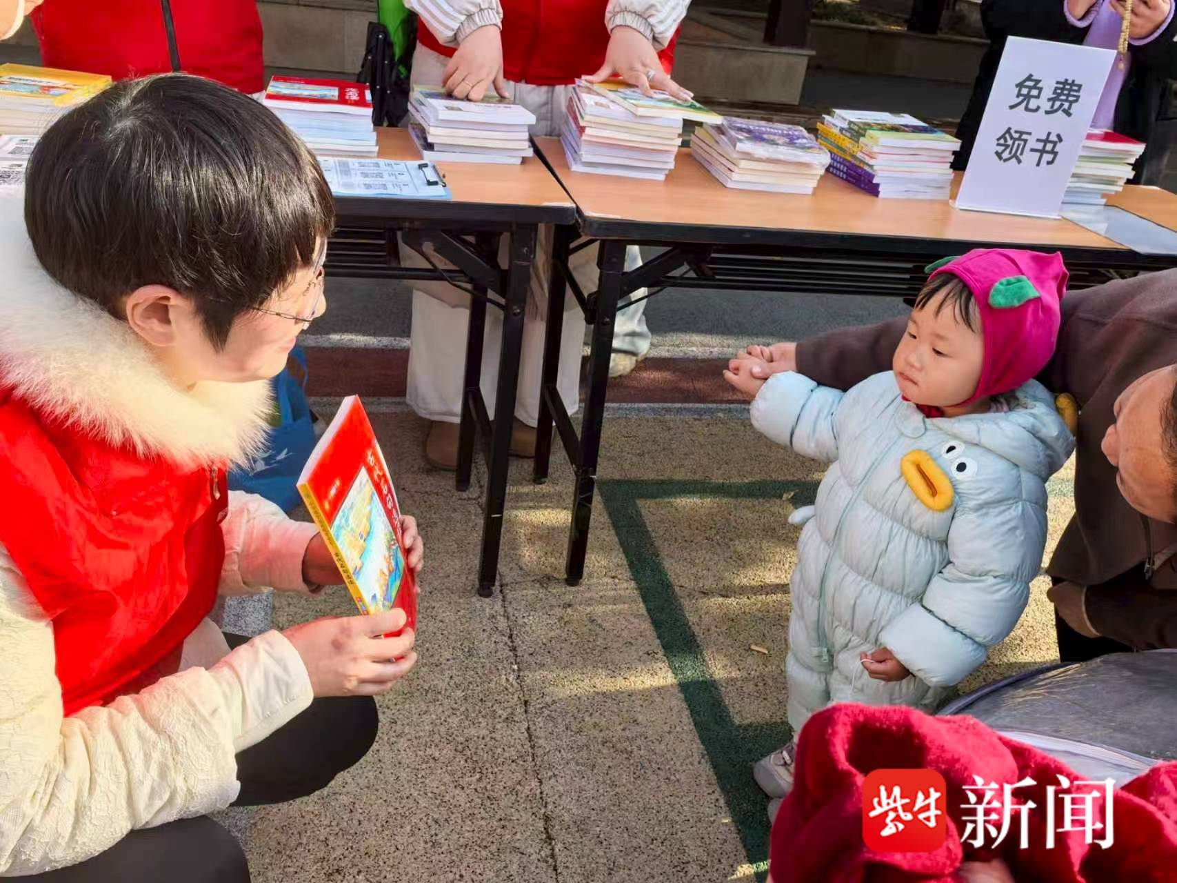 活动现场热闹非凡,志愿者们身着红色志愿马甲,早早来到现场布置赠书摊位。科普绘本、儿童文学、成长励志等各类优质书籍被整齐码放在桌台上,涵盖幼儿启蒙、中小学课外阅读等多个年龄段,满足不同孩子的阅读需求。居民们带着孩子陆续赶来,有的认真翻阅书目,有的向志愿者咨询书籍内容,孩子们更是迫不及待地挑选着自己喜欢的图书,脸上洋溢着喜悦的笑容。