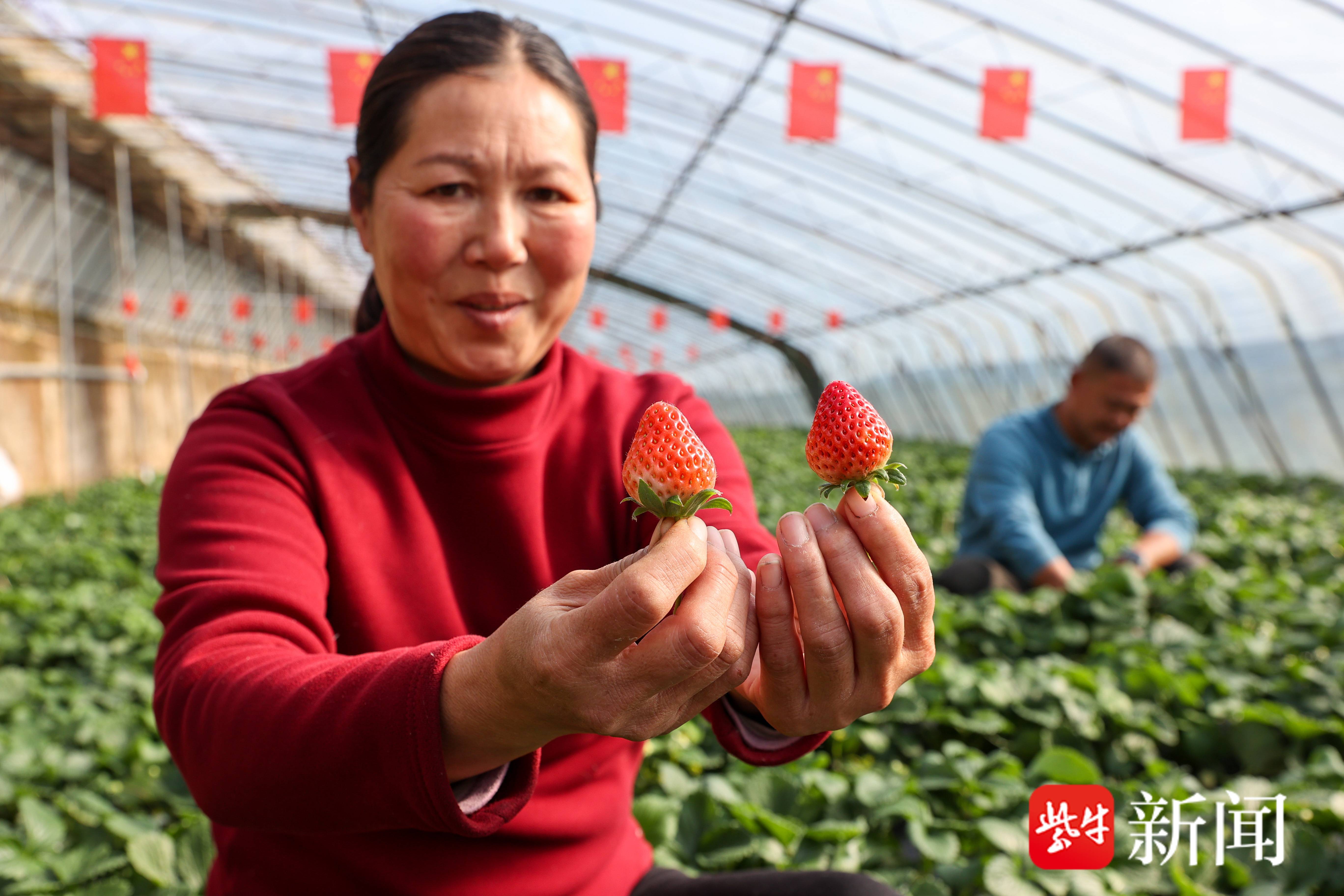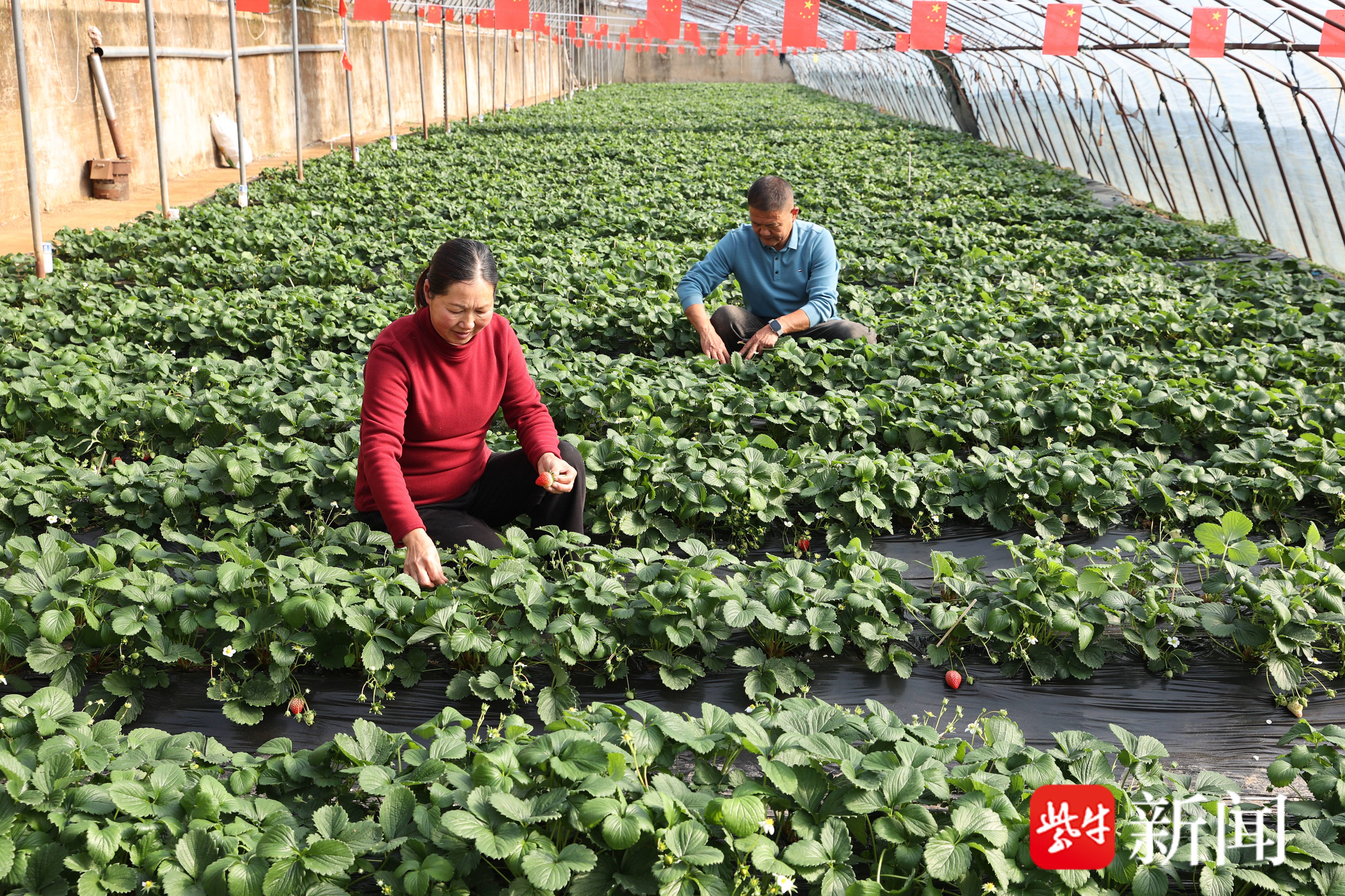 近日,在连云港市赣榆区黑林镇李良庄村熊山采摘园的大棚内,果农采摘头茬草莓。