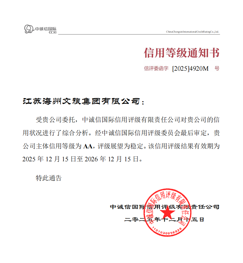 近日,江苏海州文旅集团有限公司经权威信用评级机构中诚信国际信用评级有限公司综合评定,正式斩获AA主体信用评级,评级展望为稳定,有效期自2025年12月15日至2026年12月15日。