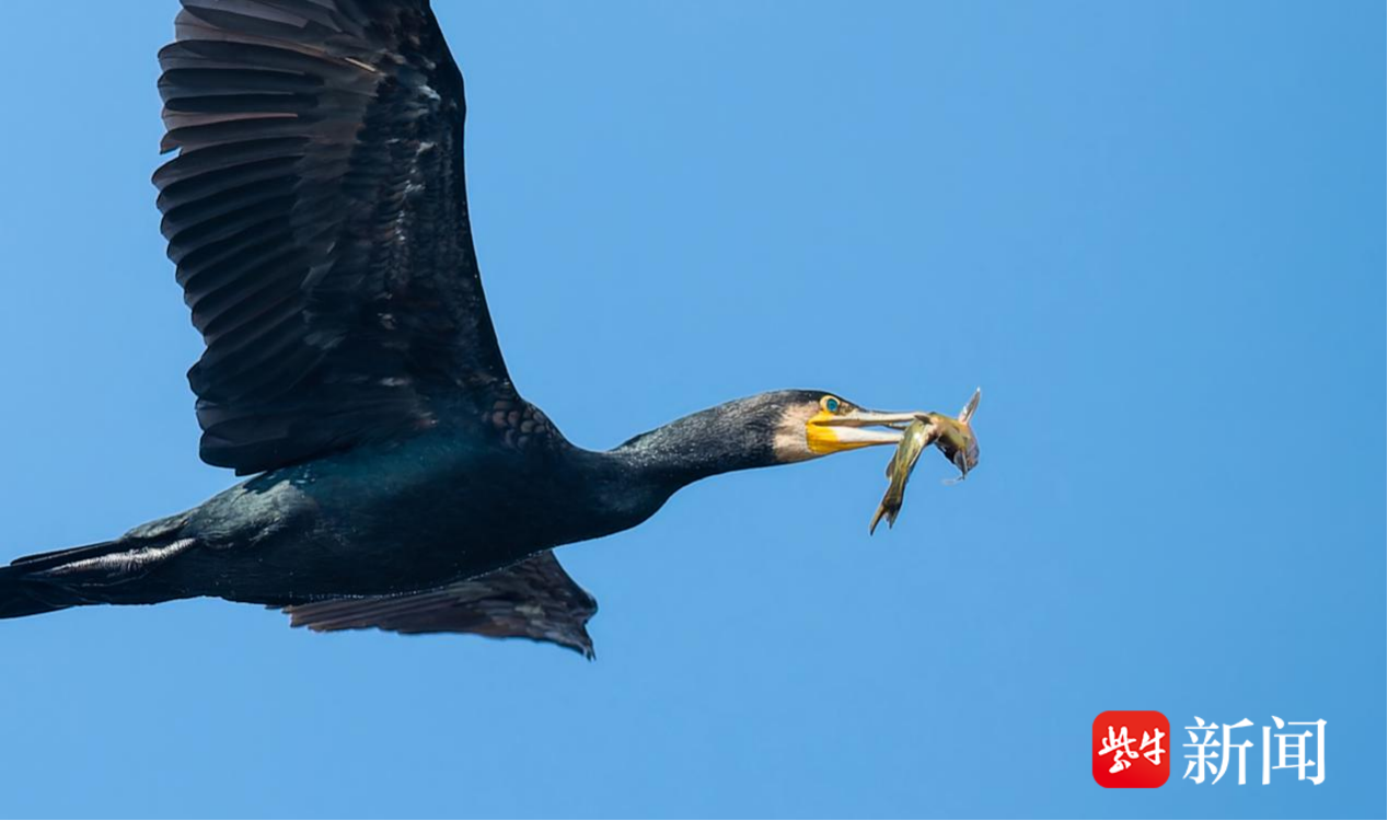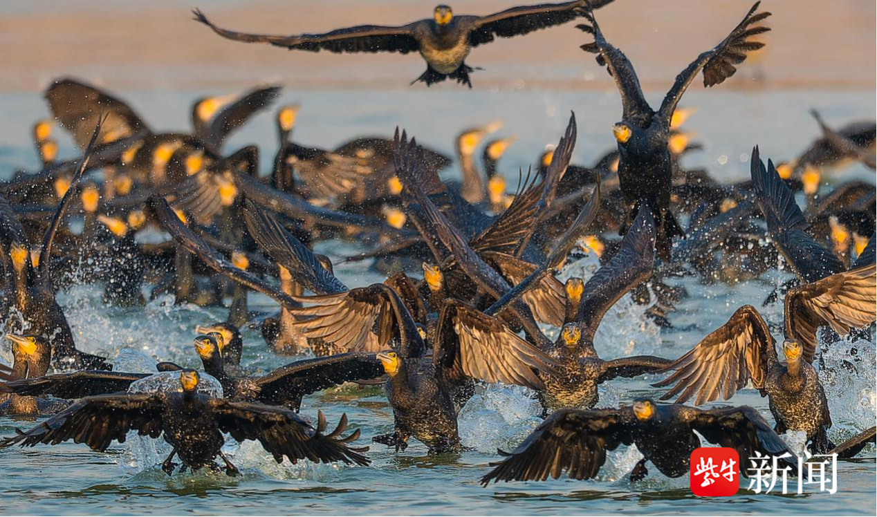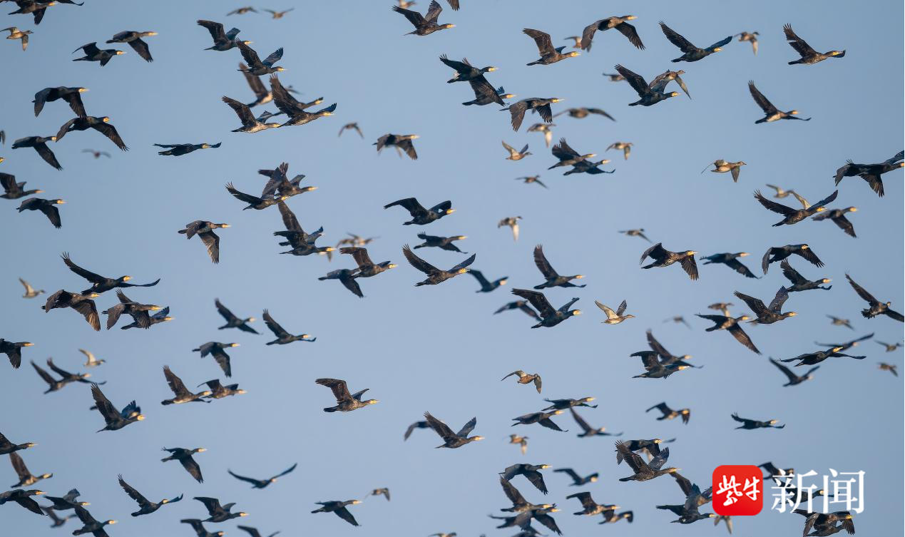 入冬以来,连云港市海州区月牙岛湿地公园再现生态盛景:数千只野生鸬鹚集结于870亩开阔湖面,或潜水觅食、嬉戏游弋,或振翅掠过波光水面,或停歇树梢晾晒羽毛。灵动身影与清澈湖水、沿岸冬景相映成趣,构成一幅生机盎然的自然画卷,不仅吸引大批市民、摄影爱好者驻足定格,更成为港城冬季生态向好的生动注脚。