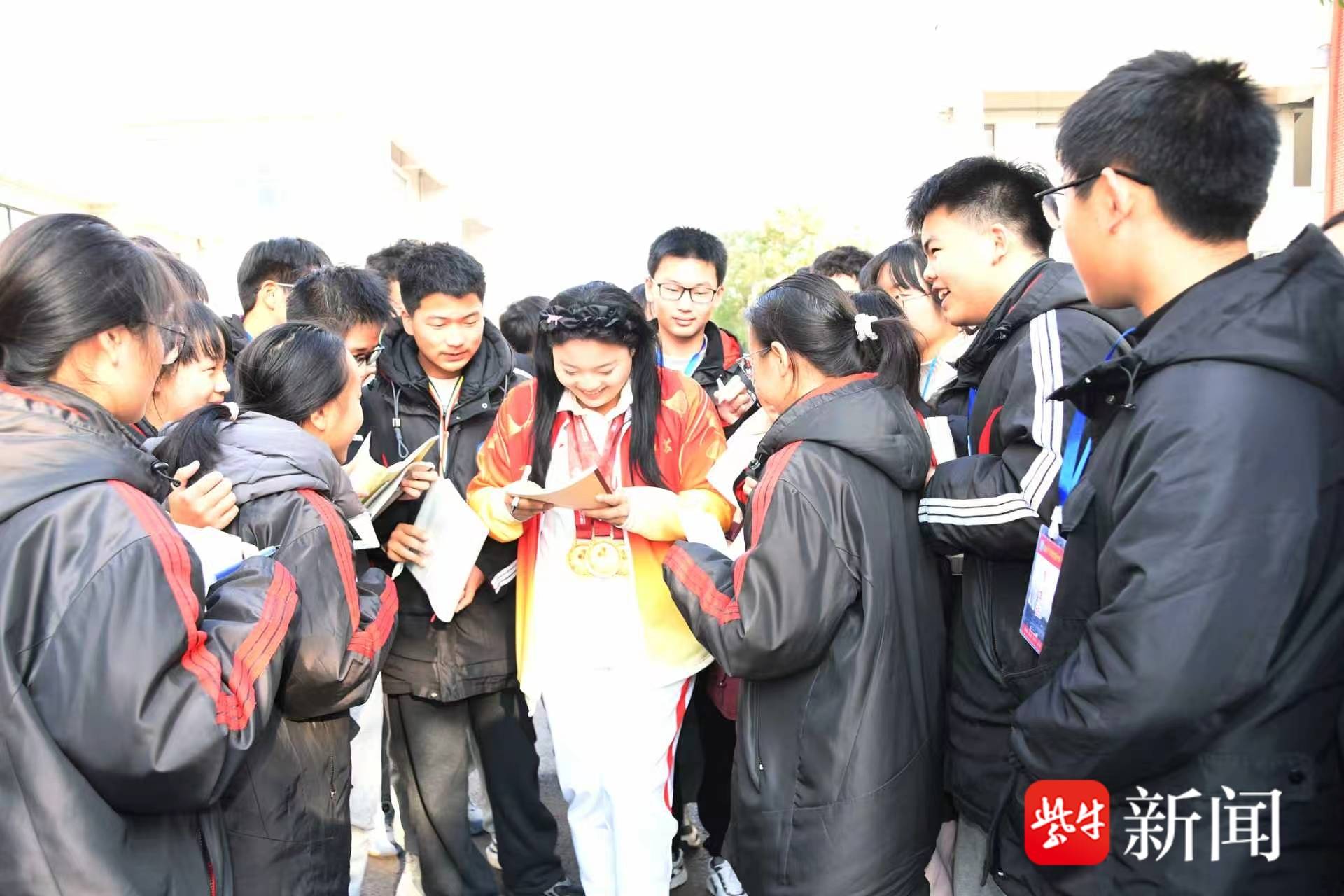 报告会上,韦嘉学姐向同学们娓娓道来自己的重生之路。从绝望挣扎到咬牙坚持,从康复训练的剧痛到赛场夺金的荣光,每一个细节都感人至深。她坦言,母校的教诲和拼搏精神,是支撑自己跨越坎坷的重要力量。互动环节中,同学们踊跃提问,韦嘉真诚分享自己面对困境的心态调整与奋斗心得,朴实的话语里满是坚韧与乐观,让在场师生深受触动。学生代表为她献上鲜花,稚嫩的脸庞上写满敬佩,温情的一幕令全场动容,活动期间同学们还向韦嘉学姐要了签名。