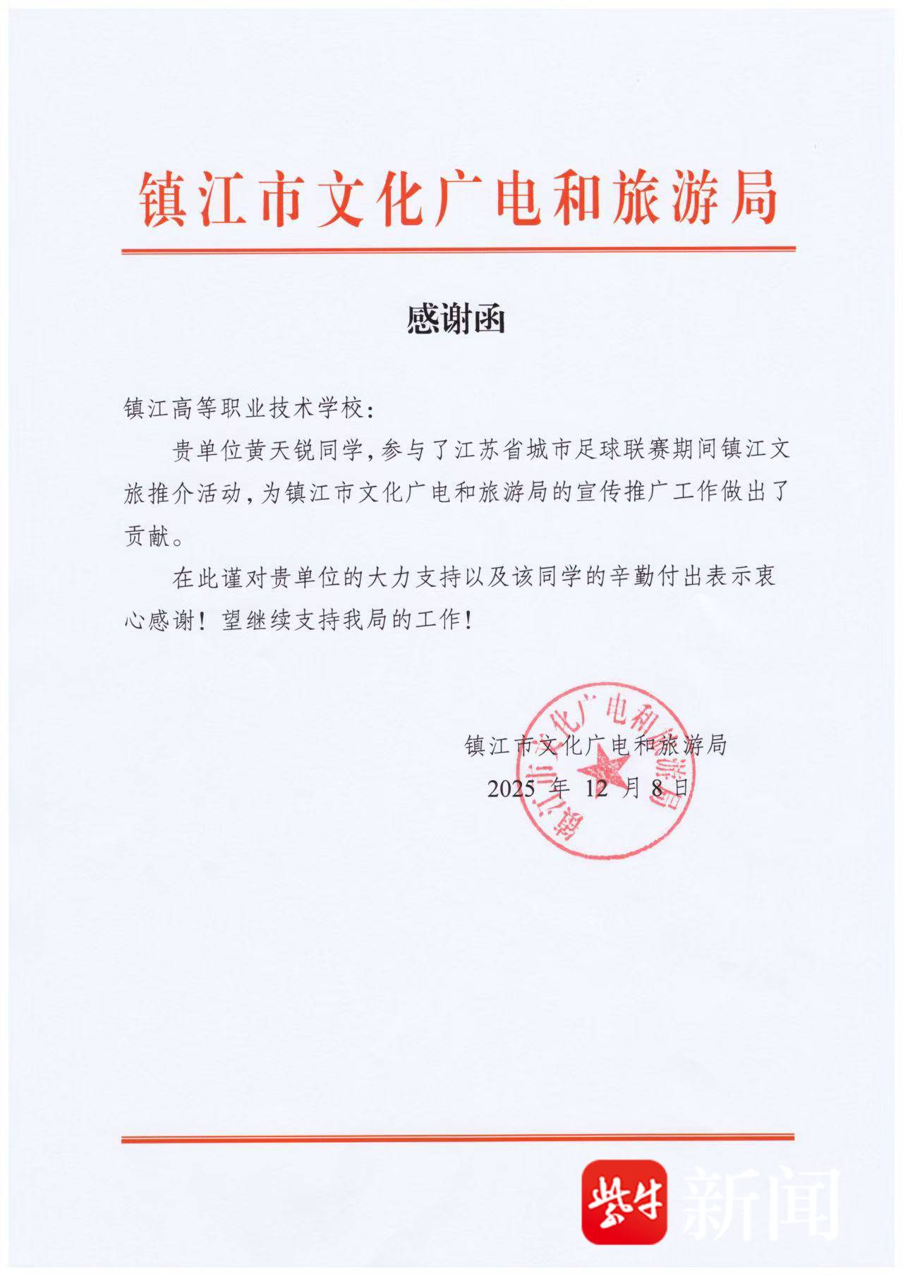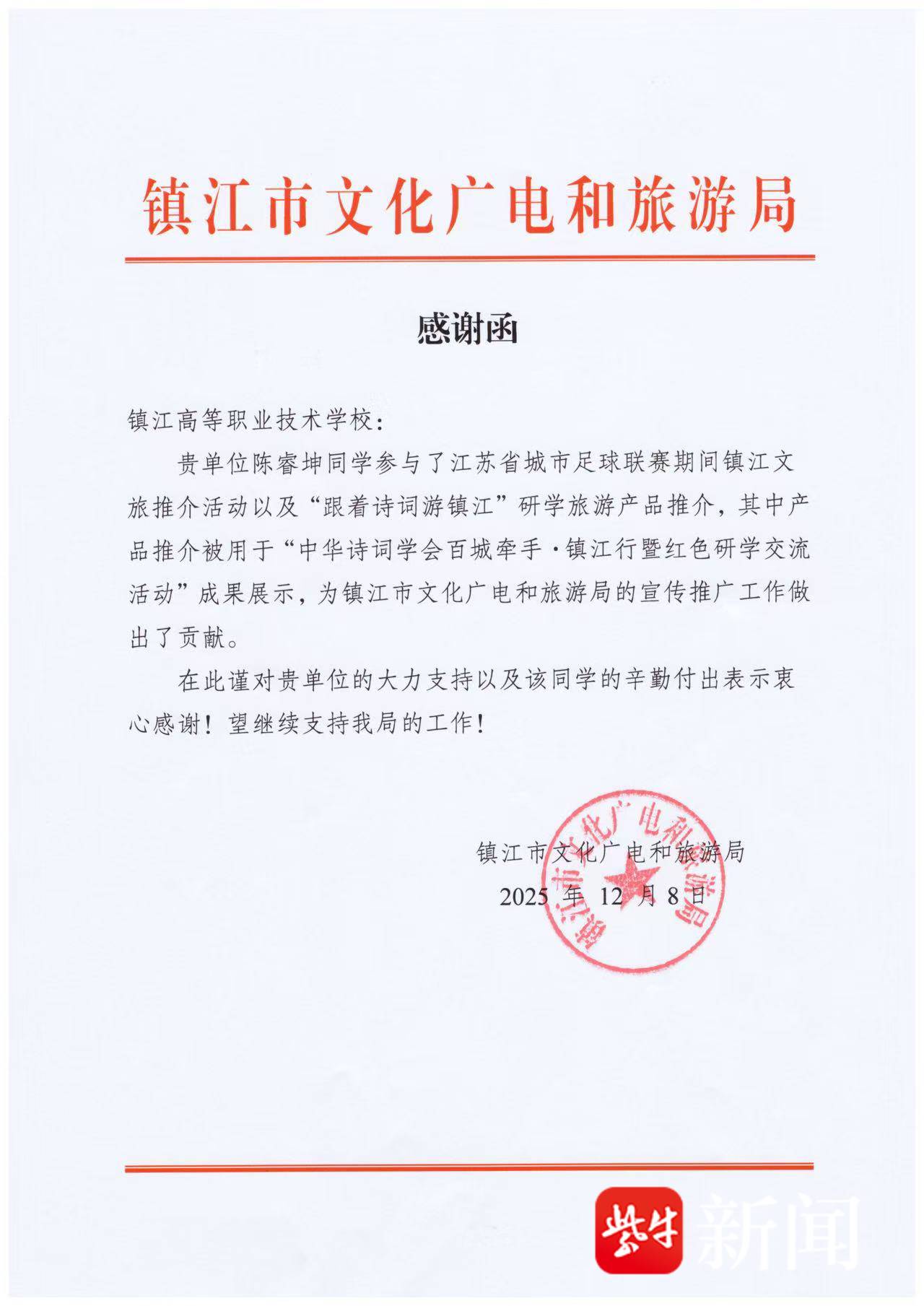 扬子晚报网12月20日讯(通讯员 姚佳 王辰薇 记者 姜天圣)近日,镇江高等职业技术学校(江苏联院镇江分院)旅游管理系收到来自镇江市文化广电和旅游局的感谢函,丰羽乡、陈睿坤、黄天锐三位同学在岗位实习期间表现优异,为镇江市文旅宣传推广工作作出了积极贡献,获得主管部门的高度认可。