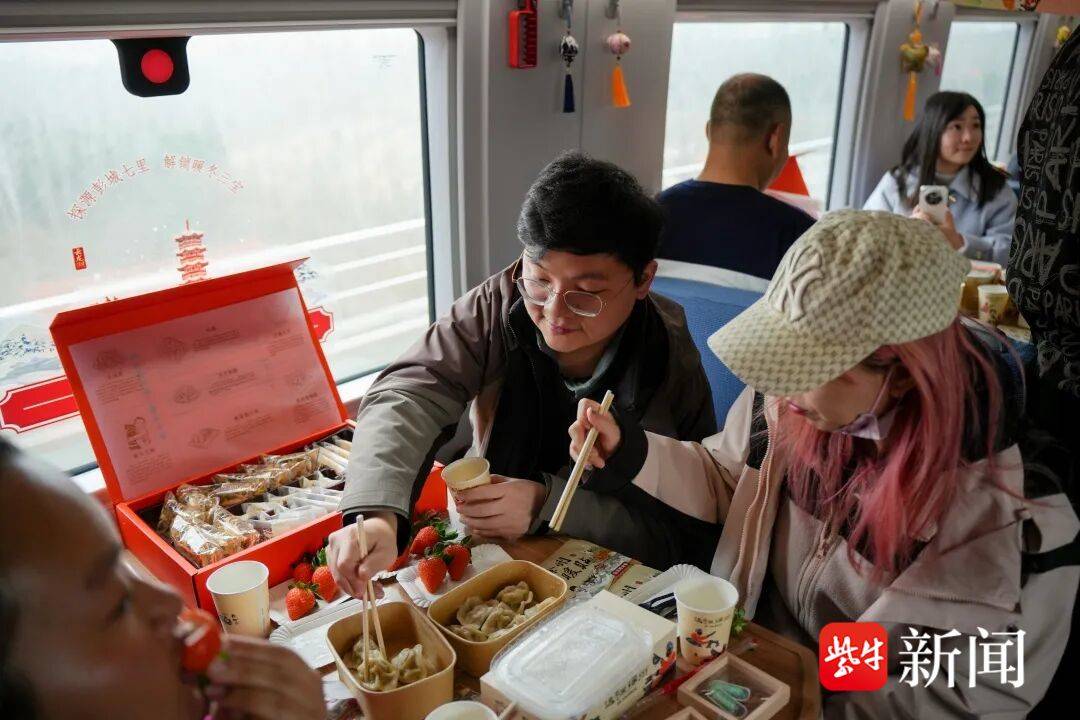 徐州文旅推介官向餐车上的旅客重点推介了“彭城七里”历史文脉与徐州“暖冬三宝”(滑雪、草莓、贾汪炒鸡)等特色冬季文旅资源,展现徐州“历史人文+冰雪运动+非遗美食”的多元魅力。
