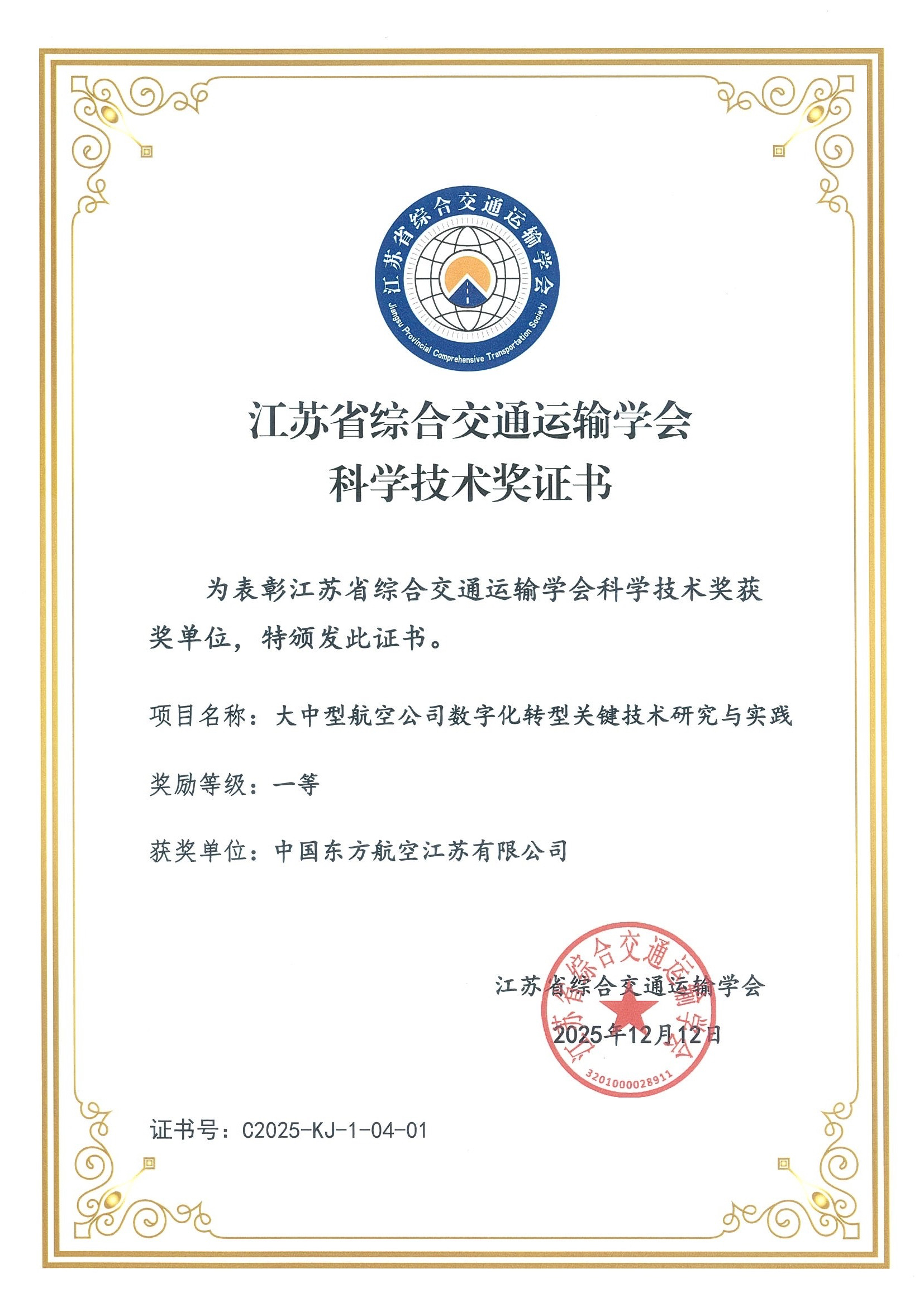 12月20日,江苏省综合交通运输学会(协会)二届四次理事会扩大会在南京召开。会上,东航江苏公司“大中型航空公司数字化转型关键技术研究与实践”研究项目荣获2025年江苏省综合交通运输学会科学技术一等奖,并举行颁奖仪式。