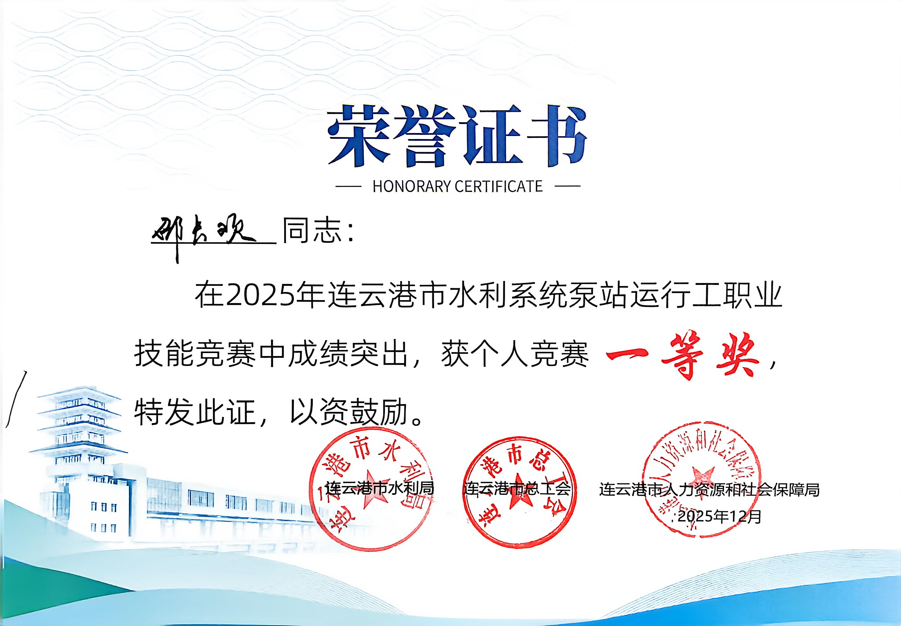 十五年如一日,邵长欢以一把扳手、一本日志、一颗匠心,在平凡的岗位上开凿出了不凡的人生深度。这份坚守与钻研,也结出了累累硕果:2021年,他荣获全市水利系统泵站运行工职业技能竞赛二等奖;2023年,又在全市水利系统闸门运行工职业技能竞赛中拔得头筹;2025年,他再次在全市水利系统泵站运行工职业技能竞赛中摘得一等奖。