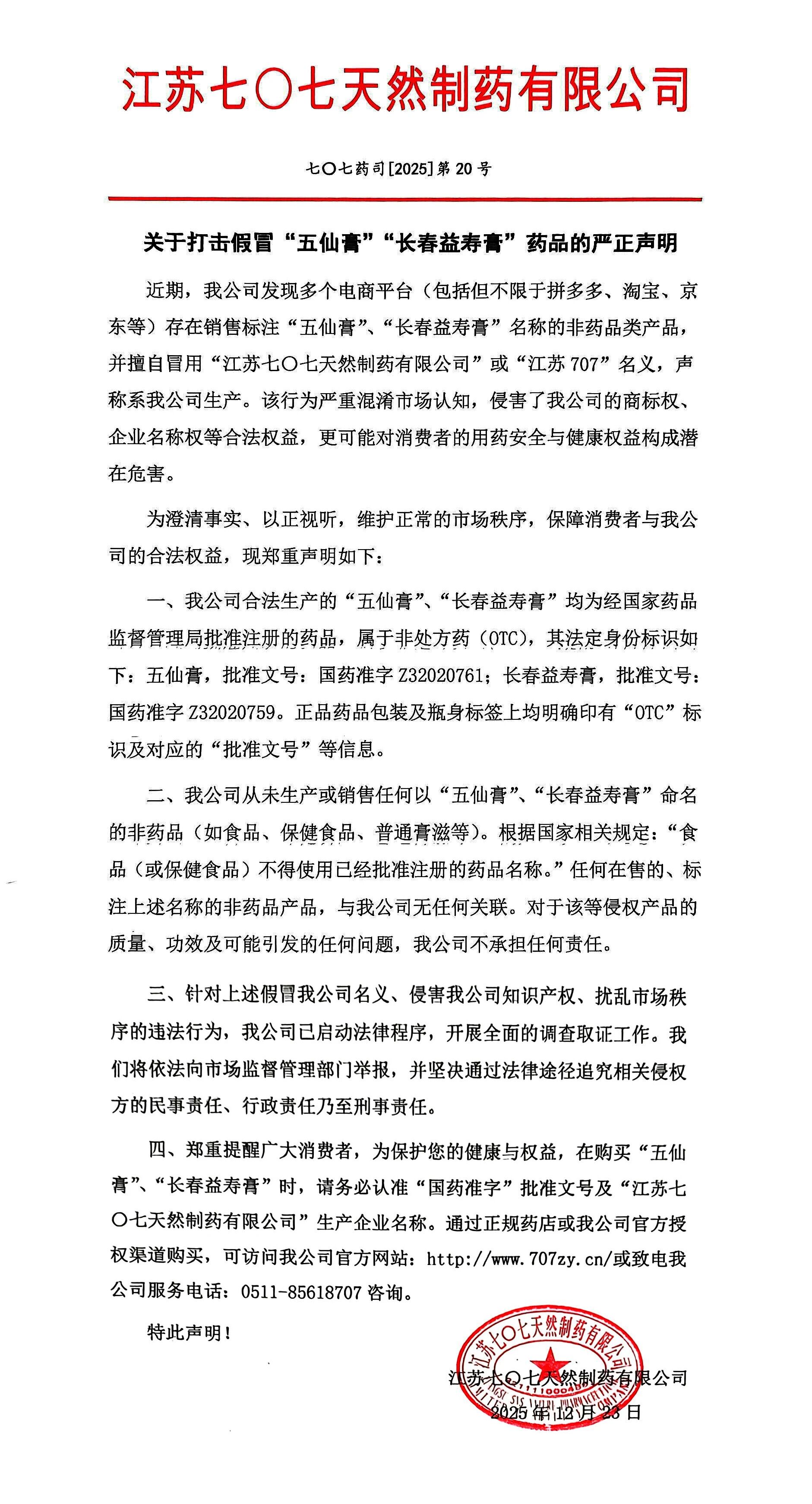 扬子晚报网12月23日讯(通讯员 成吉民 记者 万凌云 姜天圣)近日,江苏七〇七天然制药有限公司(下称 “江苏七〇七制药”)发布严正声明,剑指多个电商平台出现假冒该公司 “五仙膏”“长春益寿膏” 的非药品类产品,部分商家擅自冒用企业名义声称系其生产。该行为不仅侵害企业合法权益,更对消费者用药安全构成潜在风险。