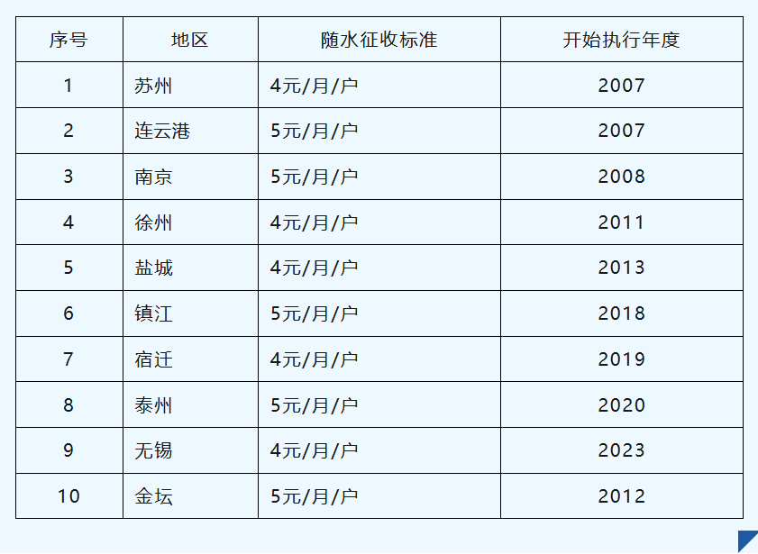 四是衔接周边城市。目前省内苏州(2007年)、南京(2008年)、徐州(2011年)、镇江(2018年)、宿迁(2019年)、泰州(2020年)、无锡(2023年)及我市金坛区(2012年)等地个人负担的生活垃圾处理费已改为按住户随水征收方式。