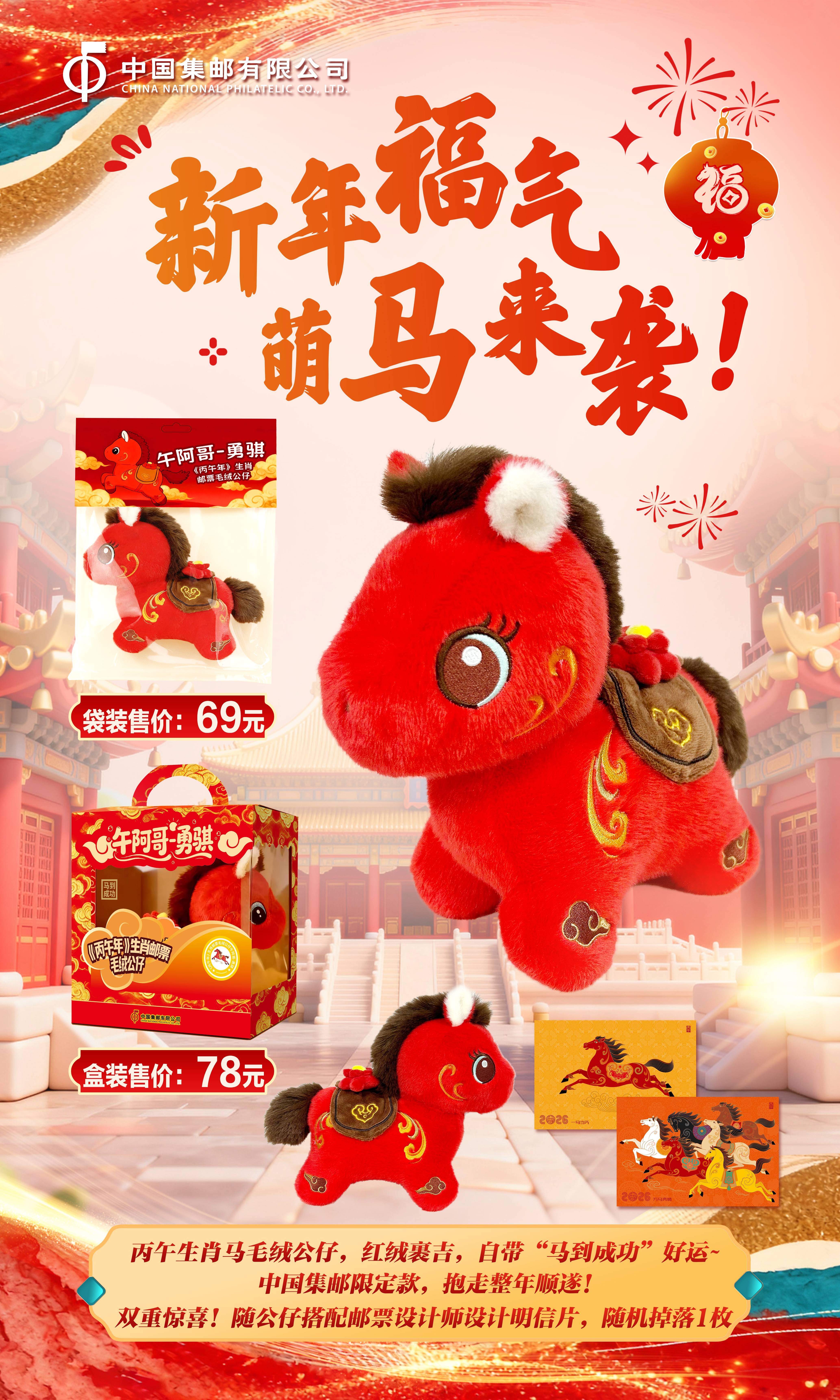 这一次,中国邮政不止于发行,更致力于让这张“国家名片”走出集邮册,走进生产线,走向大众消费市场。依托扬州完备的毛绒玩具产业链,中国邮政推出官方授权限定文创产品——“午阿哥-勇骐”生肖邮票毛绒公仔。该产品严格依照邮票原图进行1:1放大Q版还原,在保留艺术神韵的同时,注入柔软触感与童趣表达,每只公仔还附赠主创团队设计的纪念明信片,兼具收藏价值与情感温度。