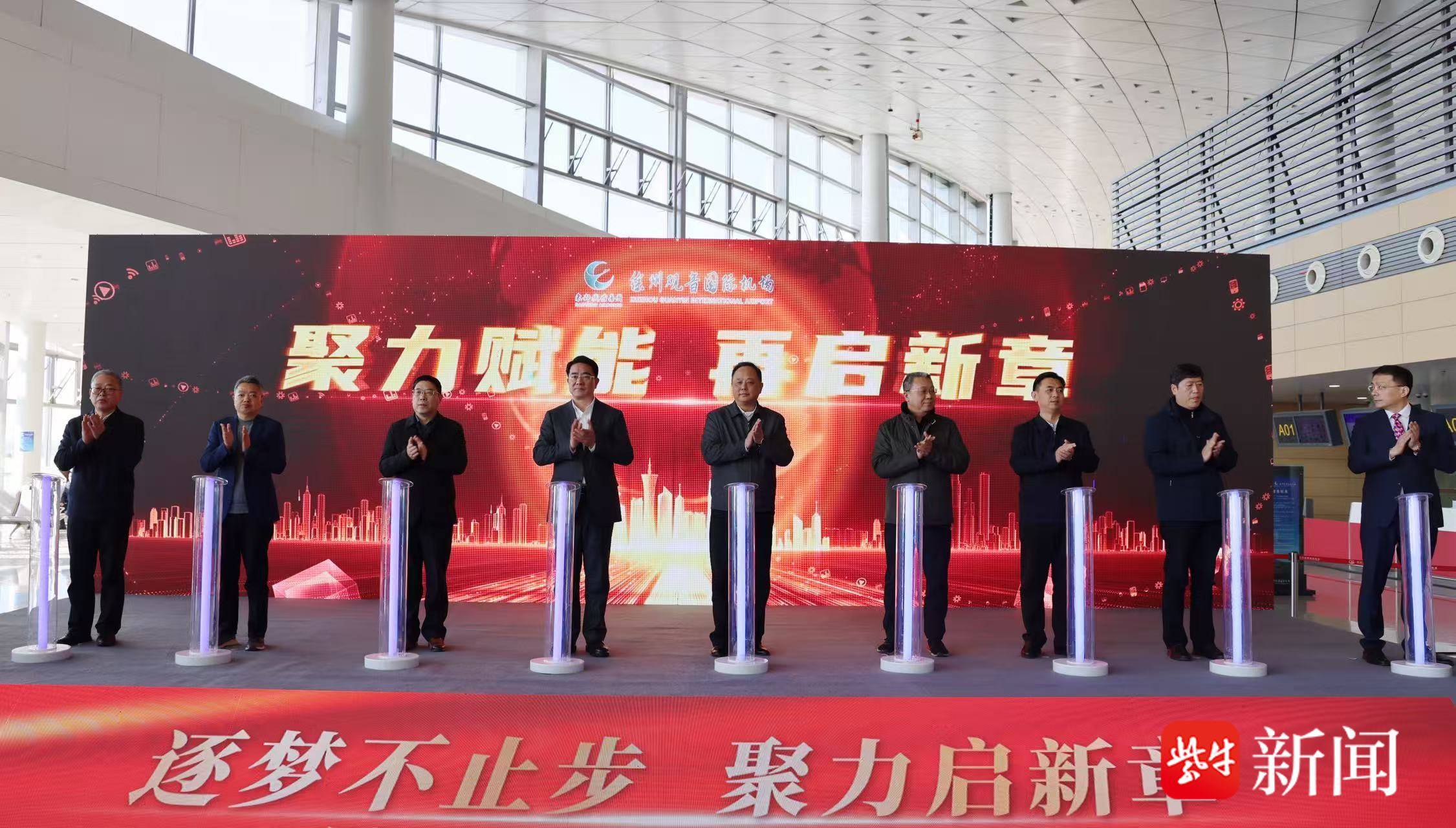 12月25日上午,东部机场集团徐州观音国际机场举办“跨越四百万发布会”,机场年旅客吞吐量首次突破400万大关,实现新跨越。民航江苏监管局副局长周泳,东部机场集团副总经理戴川秋,徐州、宿迁以及枣庄、宿州、淮北等市政府相关领导,浙江长龙航空、四川航空、南方航空、海南航空、华夏航空等十余家航空公司相关领导,各OTA平台、驻场单位、旅游企业代表参加活动。
