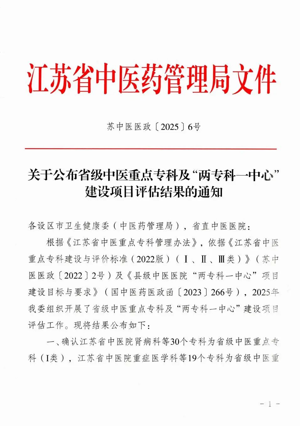 扬子晚报网12月27日讯(通讯员 童雯 柯荣军 记者 姜天圣)近日,江苏省中医药管理局正式印发《关于公布省级中医重点专科及“两专科一中心”建设项目评估结果的通知》(苏中医医政〔2025〕6号)。根据《江苏省中医重点专科管理办法》等要求,经过严格的初审、现场评审及公示等程序,镇江市中西医结合医院(又名镇江二院、镇江市老年病医院)骨伤科,成功创建成为“江苏省省级中医重点专科”。