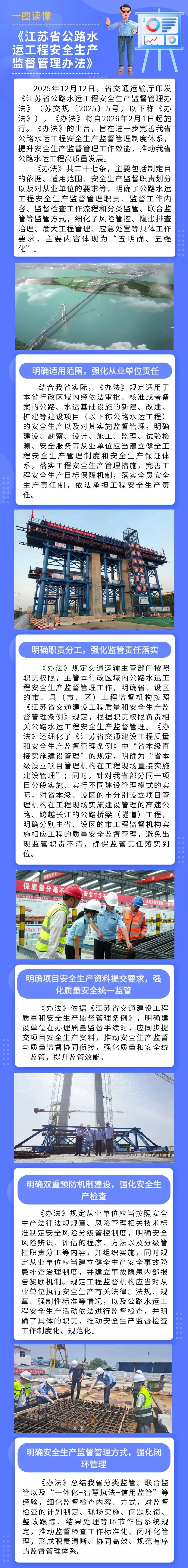 近日,省交通运输厅印发《江苏省公路水运工程安全生产监督管理办法》(以下简称《办法》),将于2026年2月1日起施行,旨在进一步完善我省公路水运工程安全生产监督管理制度体系,推动我省公路水运工程高质量发展。