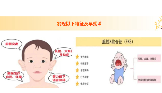 胡苏玮建议,发现以下特征及早就诊。1.大而突出的耳朵、长脸、青春期后男性睾丸较大。2.语言发育明显迟缓;学习困难、智力障碍;社交焦虑;避免眼神接触(自闭症);注意力不集中、多动;重复拍手、咬手;对声音、触摸等刺激反应过度。对于脆性X综合征而言,筛查特别重要。如果母亲是携带者,儿子有50%概率患病,女儿有50%概率成为携带者(部分可能轻度患病)。外婆传给妈妈时可能只是前突变无症状,但妈妈传给孩子时可能变成全突变而发病。早期康复训练、行为疗法等能显著改善孩子生活质量。