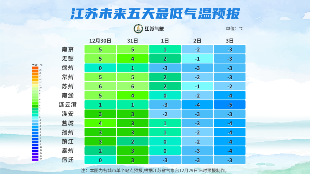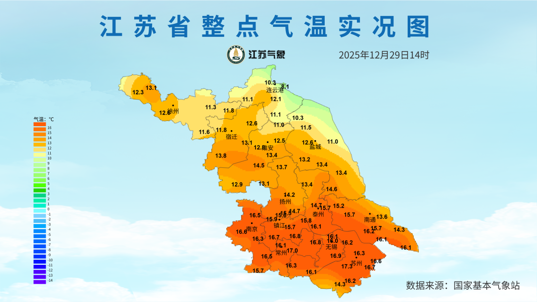 全省多云到晴。最高温度:苏南地区14℃左右,淮北地区10℃左右,其他地区12~13℃;最低温度:淮北北部地区0℃左右,本省东南部地区5~6℃,其他地区3~4℃。全省东北风4-5级。