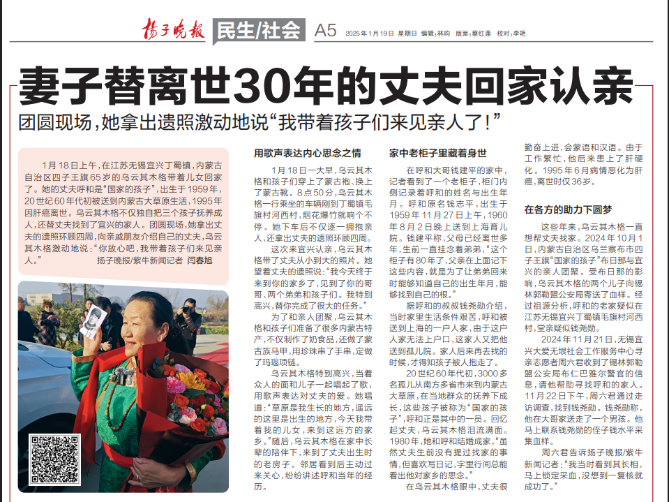 今年1月17日下午,65岁的乌云其木格从内蒙古来到南京禄口国际机场,她要替去世30年的丈夫、“国家的孩子”呼和,回宜兴认亲。我背着那个熟悉的黑色书包,跟着志愿者赶到机场。从见面那一刻起,我的工作就开始了:左手举着手机记录她颤抖的双手和湿润的眼眶,右手已在另一台手机上敲下短视频的初步文案,而口袋里的第三台手机,则全程录音,为后续的深度报道留存每一个细节。