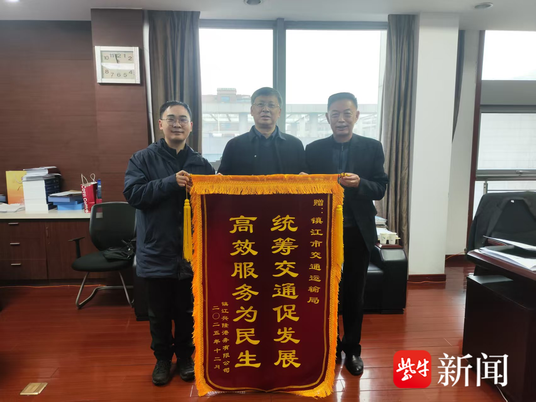 近日,镇江兴隆港务有限公司负责人将一面写有“统筹交通促发展 高效服务为民生”的鲜红锦旗送到了镇江市交通运输局,企业负责人说:“感谢你们的帮助和支持,我们港口今年吞吐量超过1000万吨,创近年来新高。”