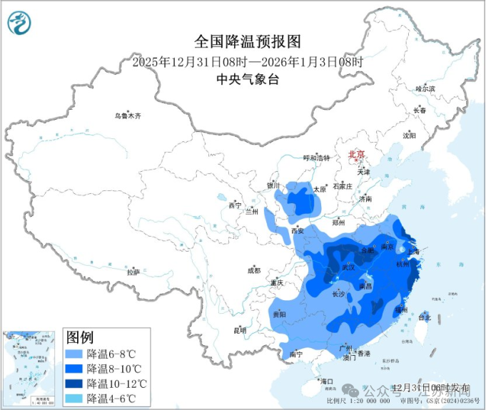 预计未来三天,多股冷空气东移南下影响我国中东部地区,期间西北地区东部、黄淮西部、江淮及以南地区日平均或最低气温将下降6~10℃,部分地区降幅可达10~12℃;1月3日早晨,最低气温0℃线将南压至湖南中南部至福建南部一带;另外,东部和东南部海域有7~8级风,阵风9~10级。