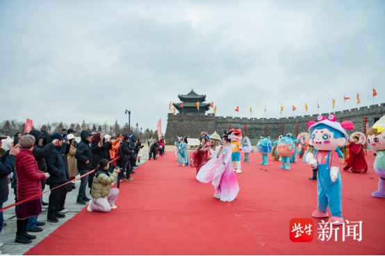 “新线启新程,纵湖笑迎八方客;佳节逢佳期,胜地喜聚四海宾。”2026年元旦的清晨,朔风裹着零星碎雪,轻拂着大纵湖的粼粼波光。景区内张灯结彩,悬挂在东晋水城大门两侧的大红对联映着白雪,将年味与雪韵揉成一幅雅致的水乡画卷。数千名来自全国各地的游客齐聚于此,共赴一场集民俗体验、潮流互动、视听盛宴于一体的跨年狂欢,在新旧交替的温馨氛围中,开启2026年的崭新篇章。