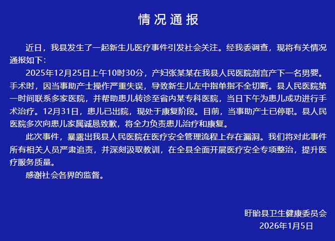 2025年12月25日上午10时30分,产妇张某某在我县人民医院剖宫产下一名男婴。手术时,因当事助产士操作严重失误,导致新生儿左中指单指不全切断。县人民医院第一时间联系多家医院,并帮助患儿转诊至省内某专科医院,当日下午为患儿成功进行手术治疗。12月31日,患儿已出院,现处于康复阶段。目前,当事助产士已停职。县人民医院多次向患儿家属诚恳致歉,将全力负责患儿治疗和康复。