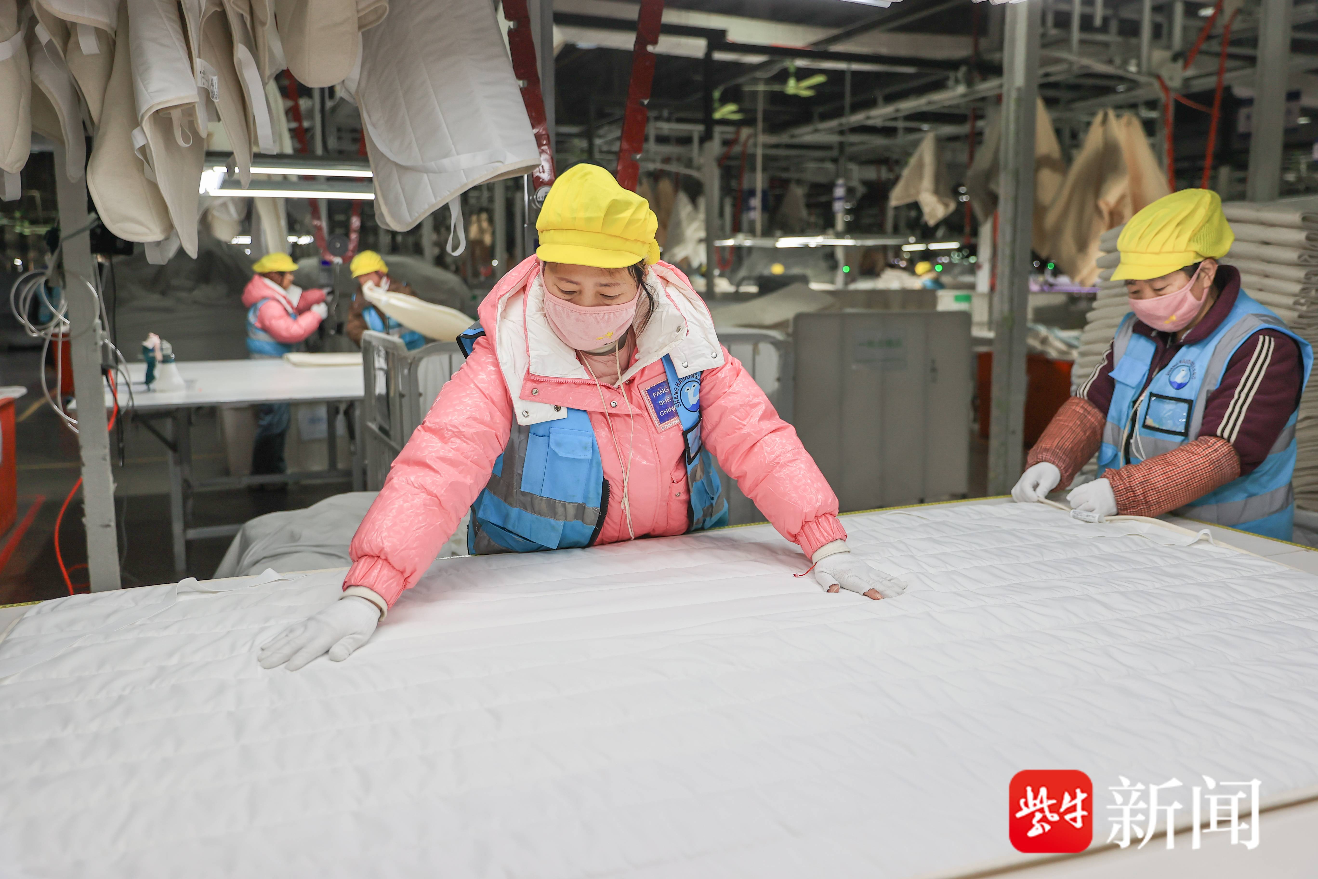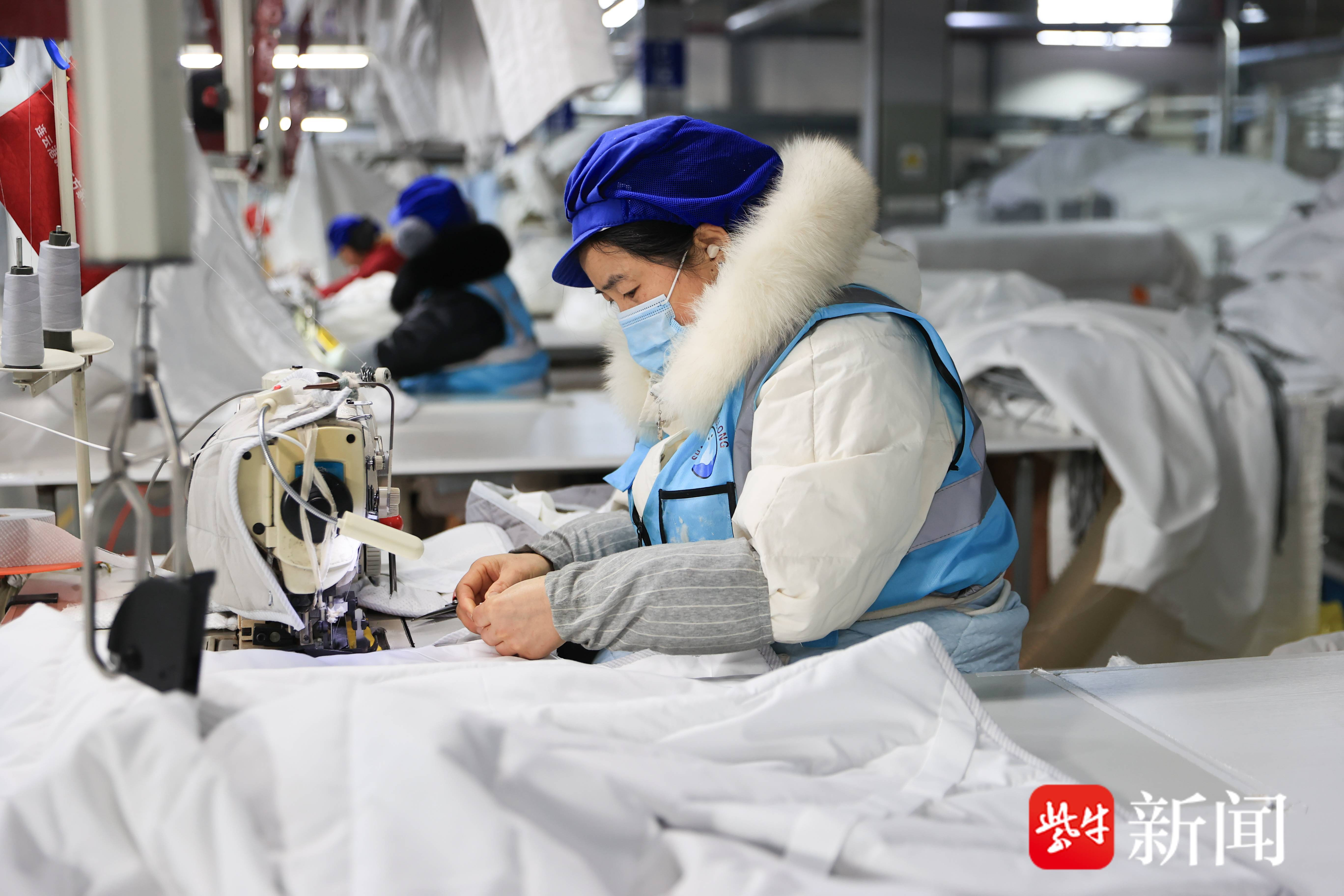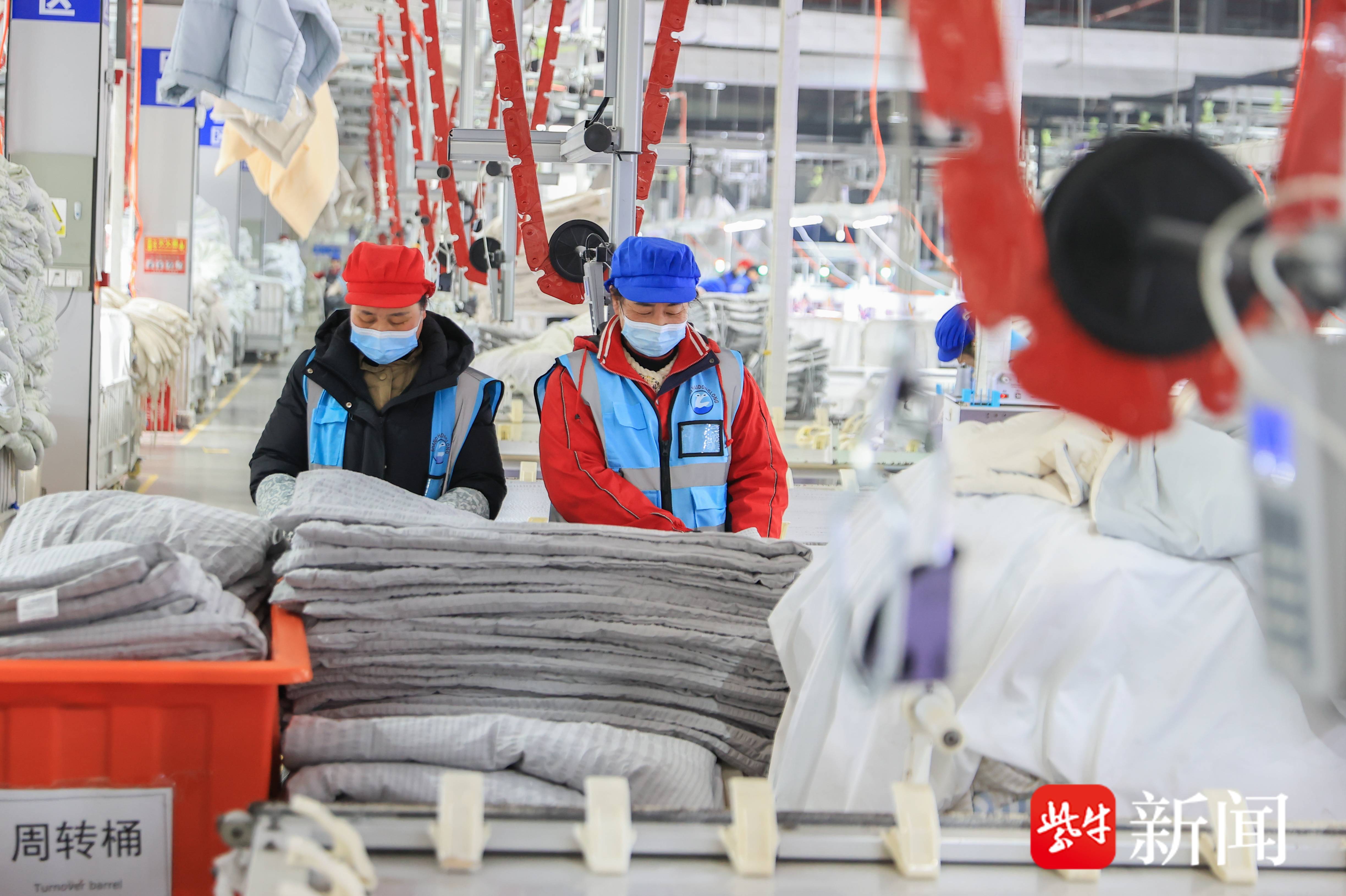 1月5日,在江苏省连云港市赣榆区金山镇新东方家纺有限公司生产车间,工人在生产线上忙碌。