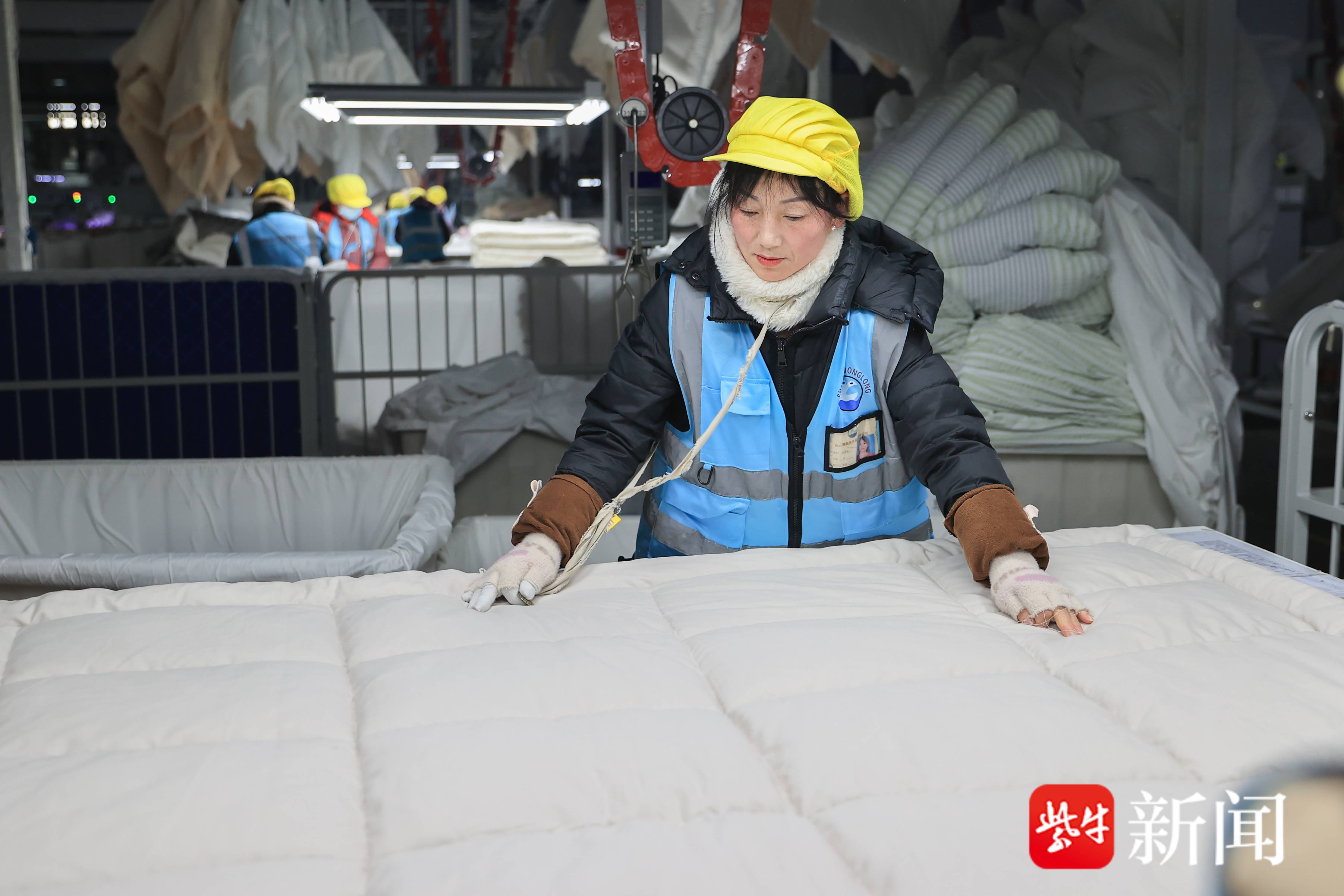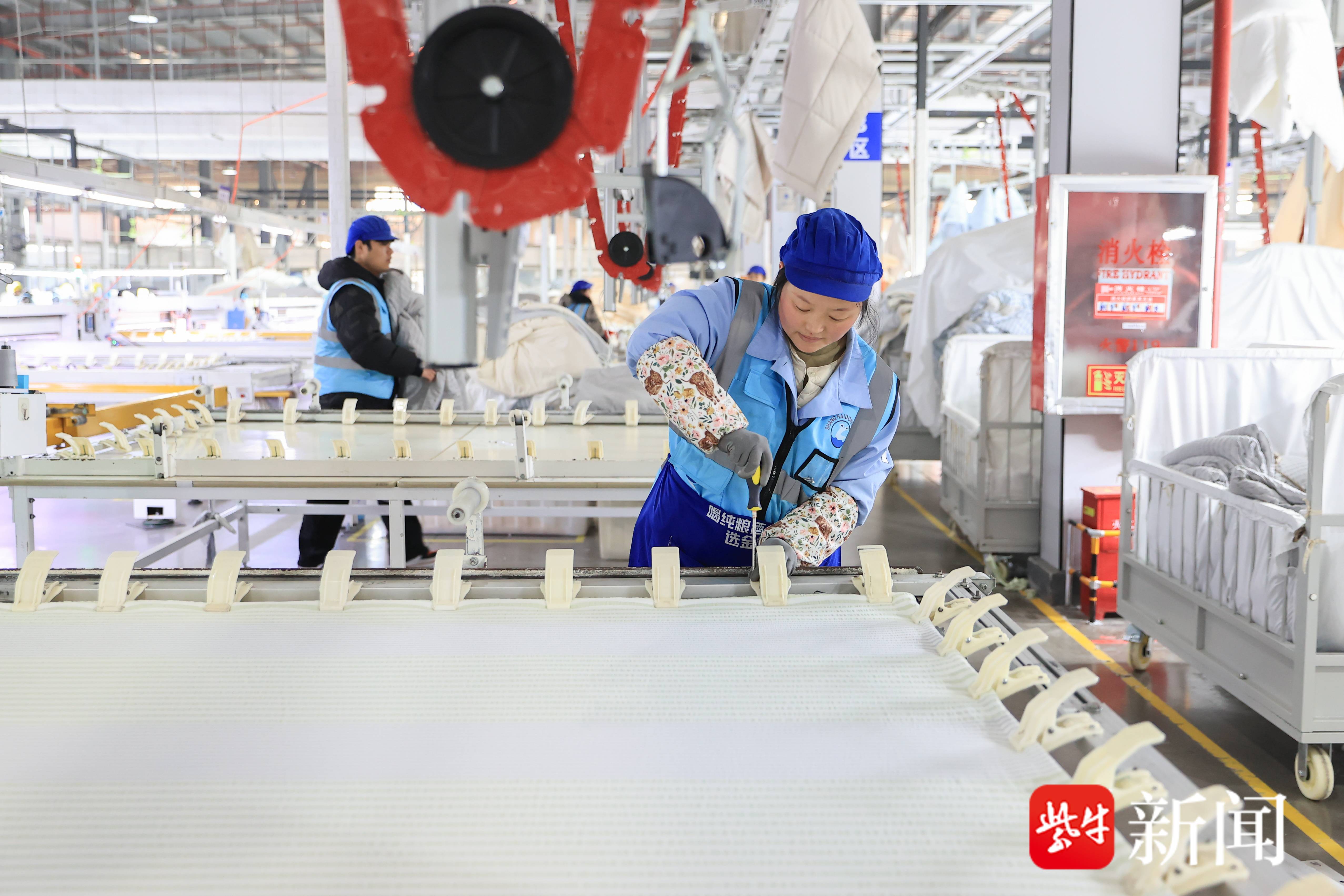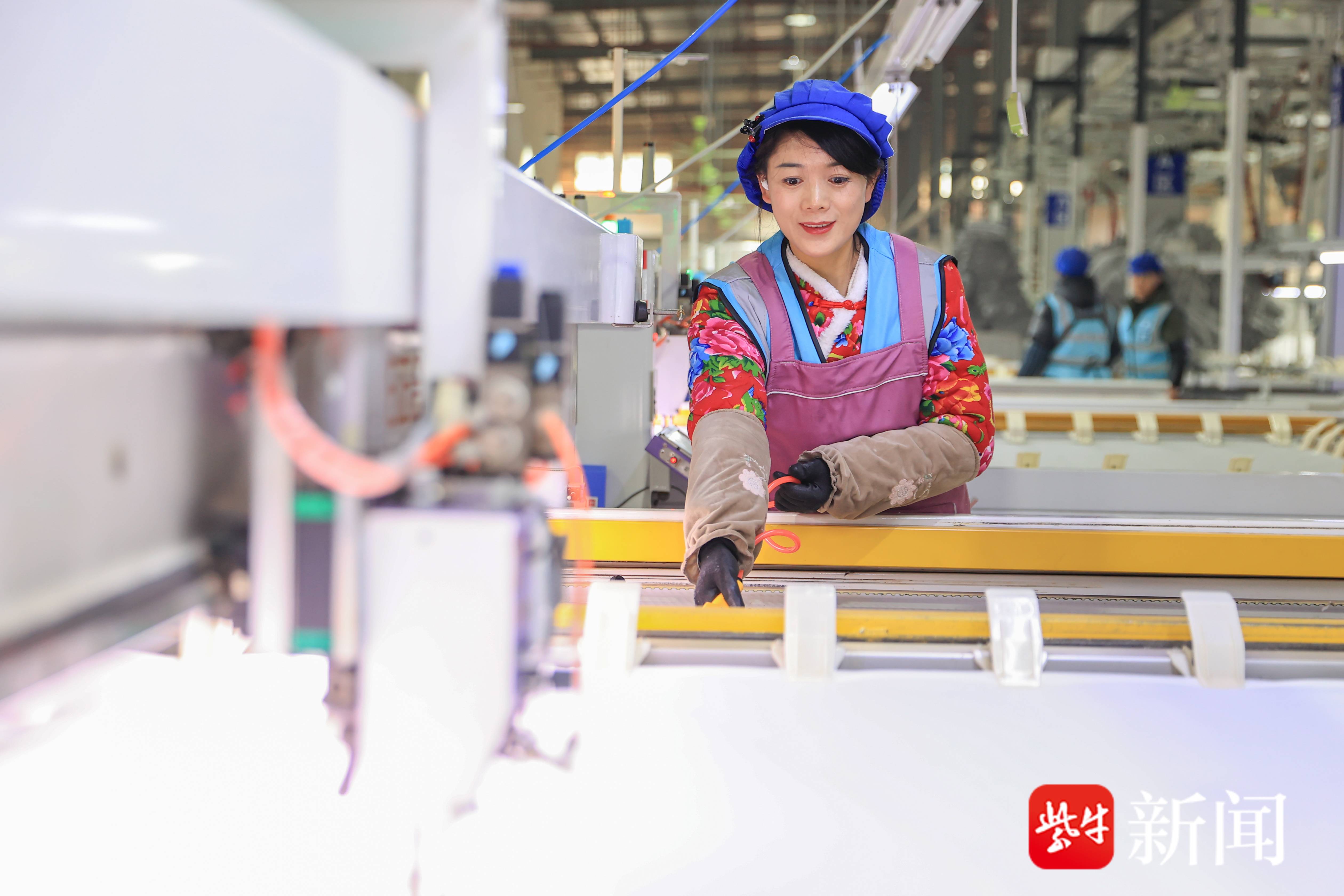 1月5日,在江苏省连云港市赣榆区金山镇新东方家纺有限公司生产车间,工人在生产线上忙碌。