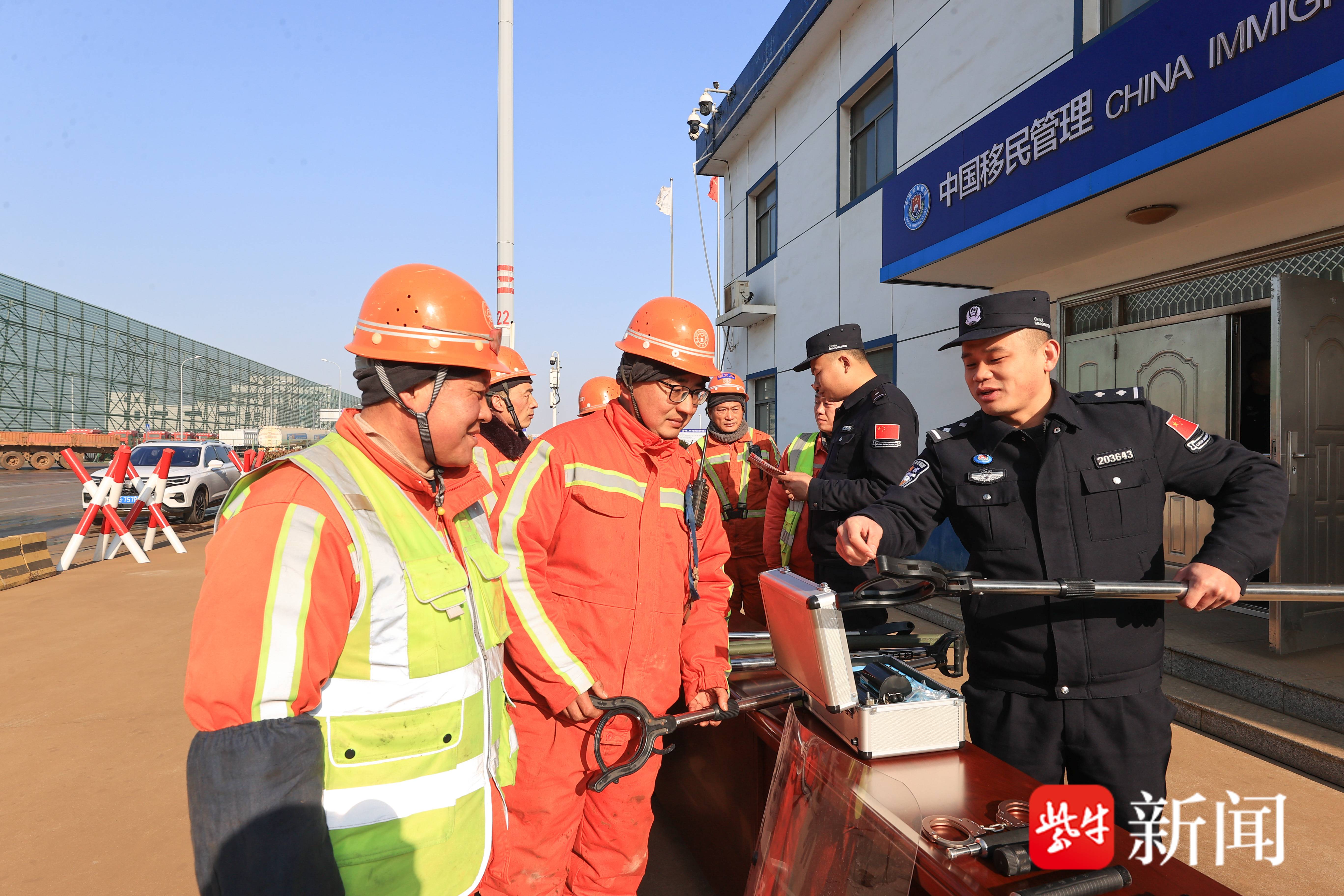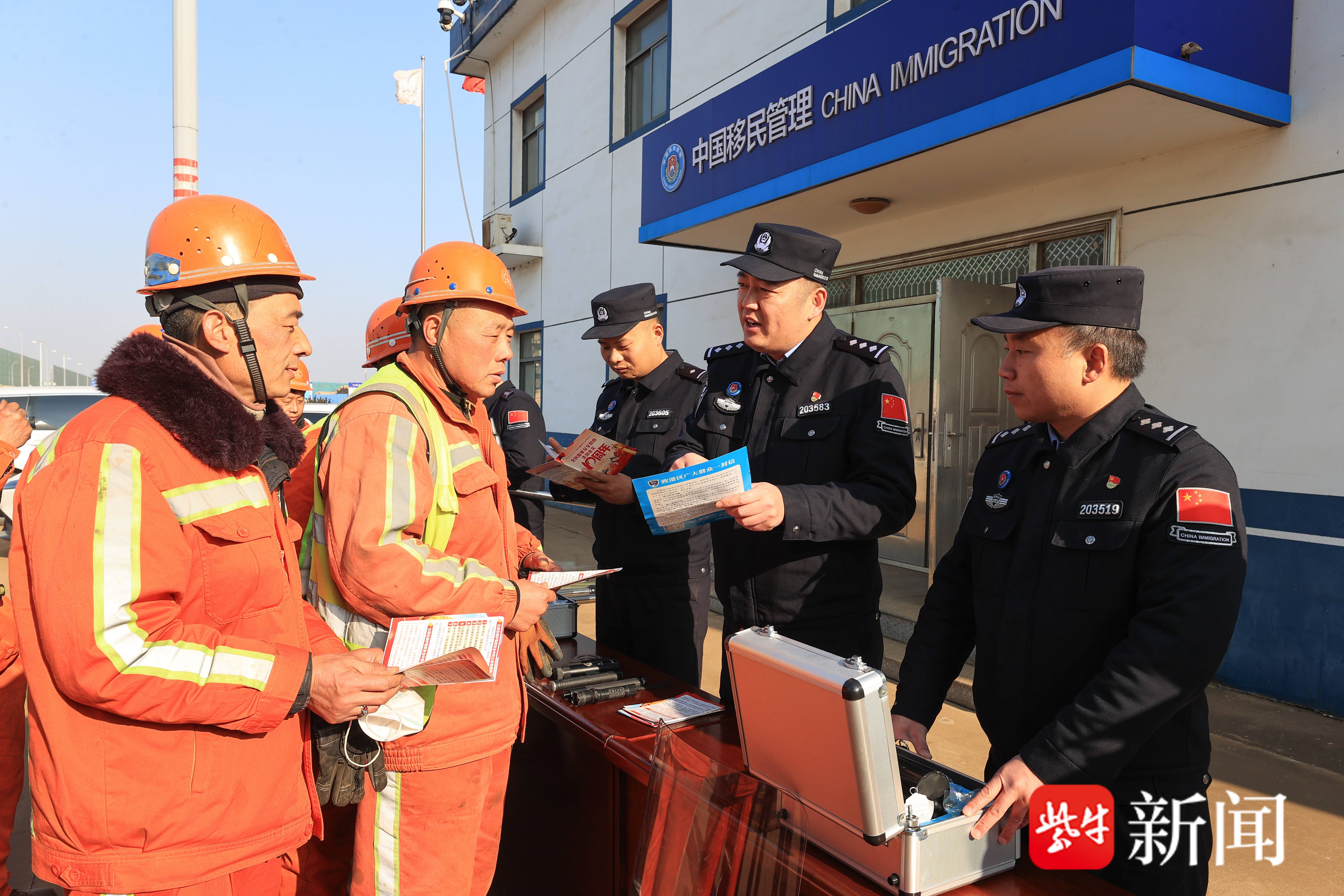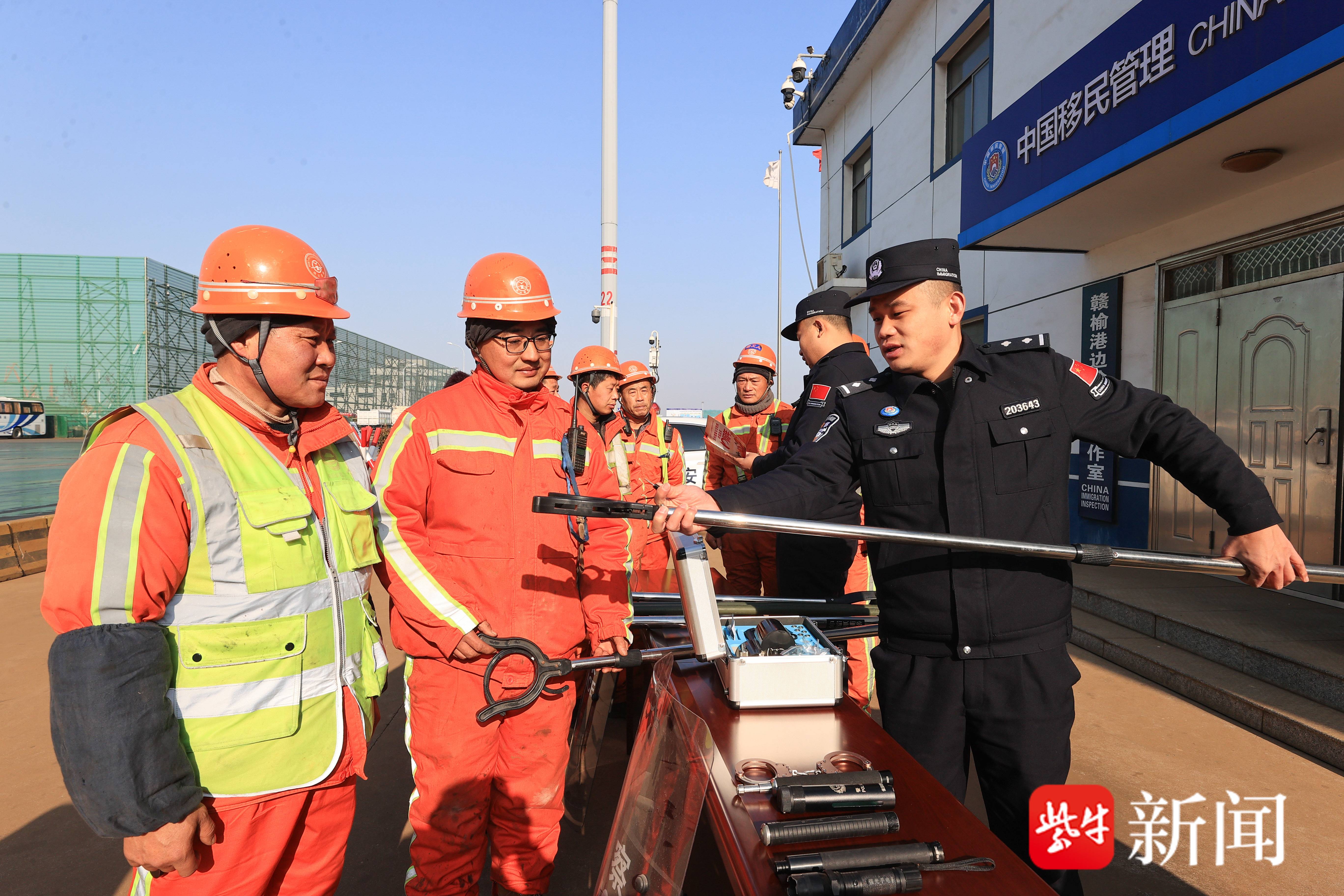 当日,赣榆港边检民警向码头工人宣传出入境管理法。