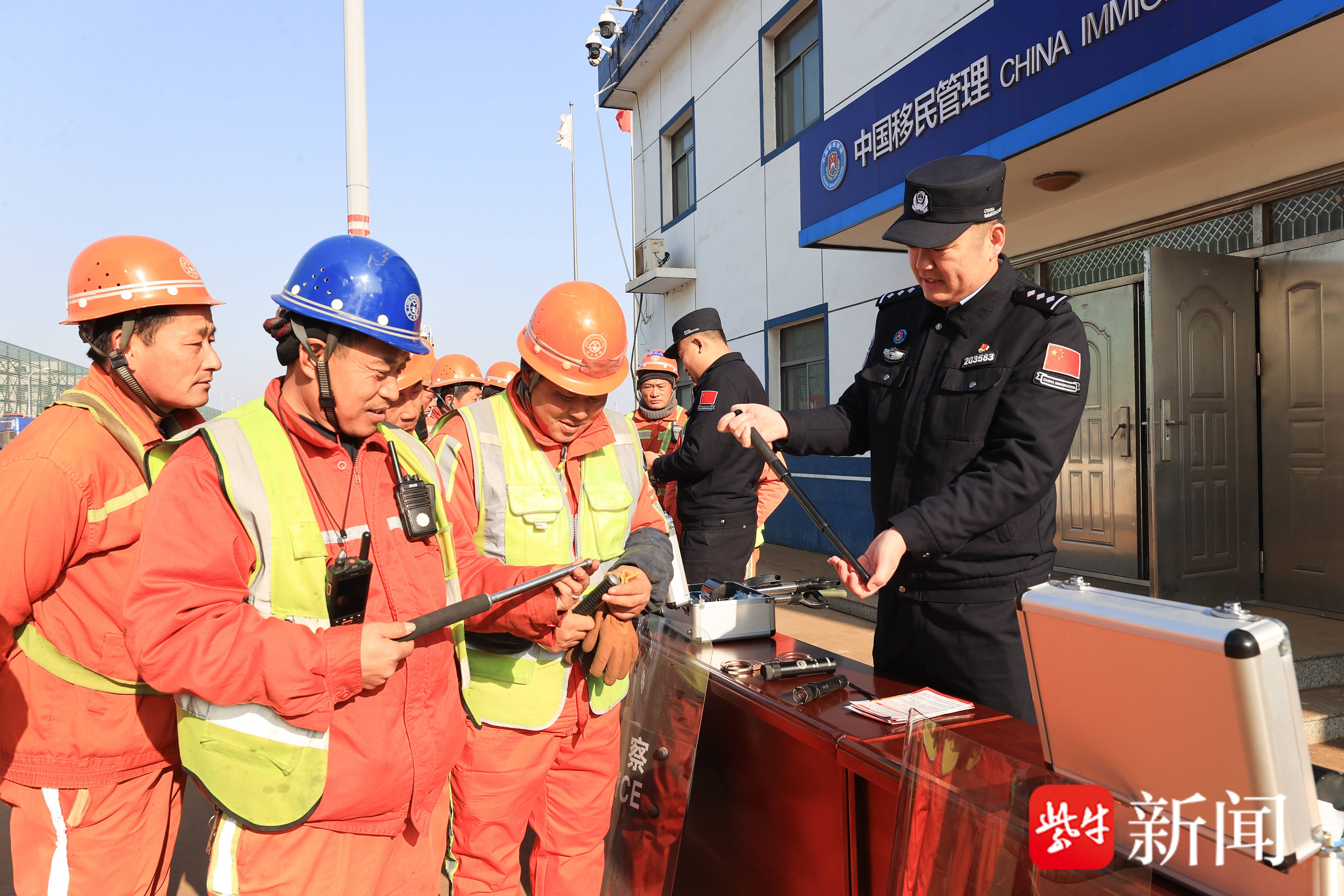 1月7日,在江苏省连云港市赣榆港边检警务开放日活动现场,码头工人在体验警用装备。
