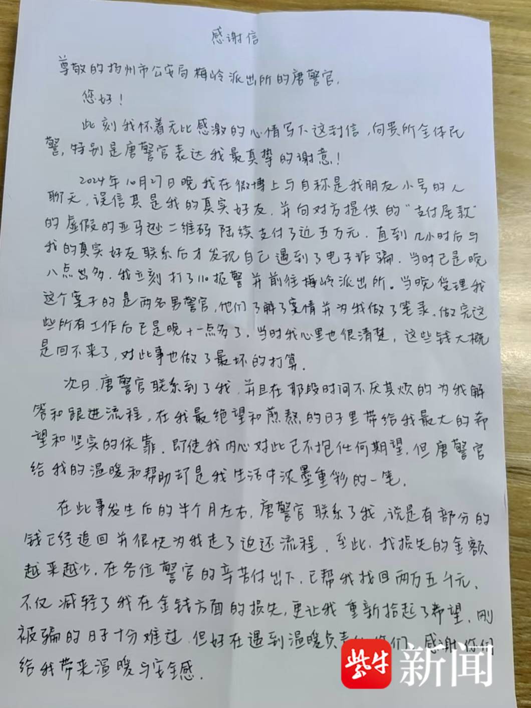 扬子晚报网1月10日讯(通讯员 姜健龙 记者 陈咏)“没想到真的还能找回来,有你们真好!”9日,市民张女士将一面锦旗和一封手写感谢信,送到了扬州市公安局蜀冈-瘦西湖风景名胜区分局梅岭派出所,锦旗上写有“人民警察为人民,失而复得暖人心”的字样;手写信书写认真,字字句句饱含情意,不仅记录了失而复得的2万多元,更见证了公安民辅警一年多来的执着和守护。