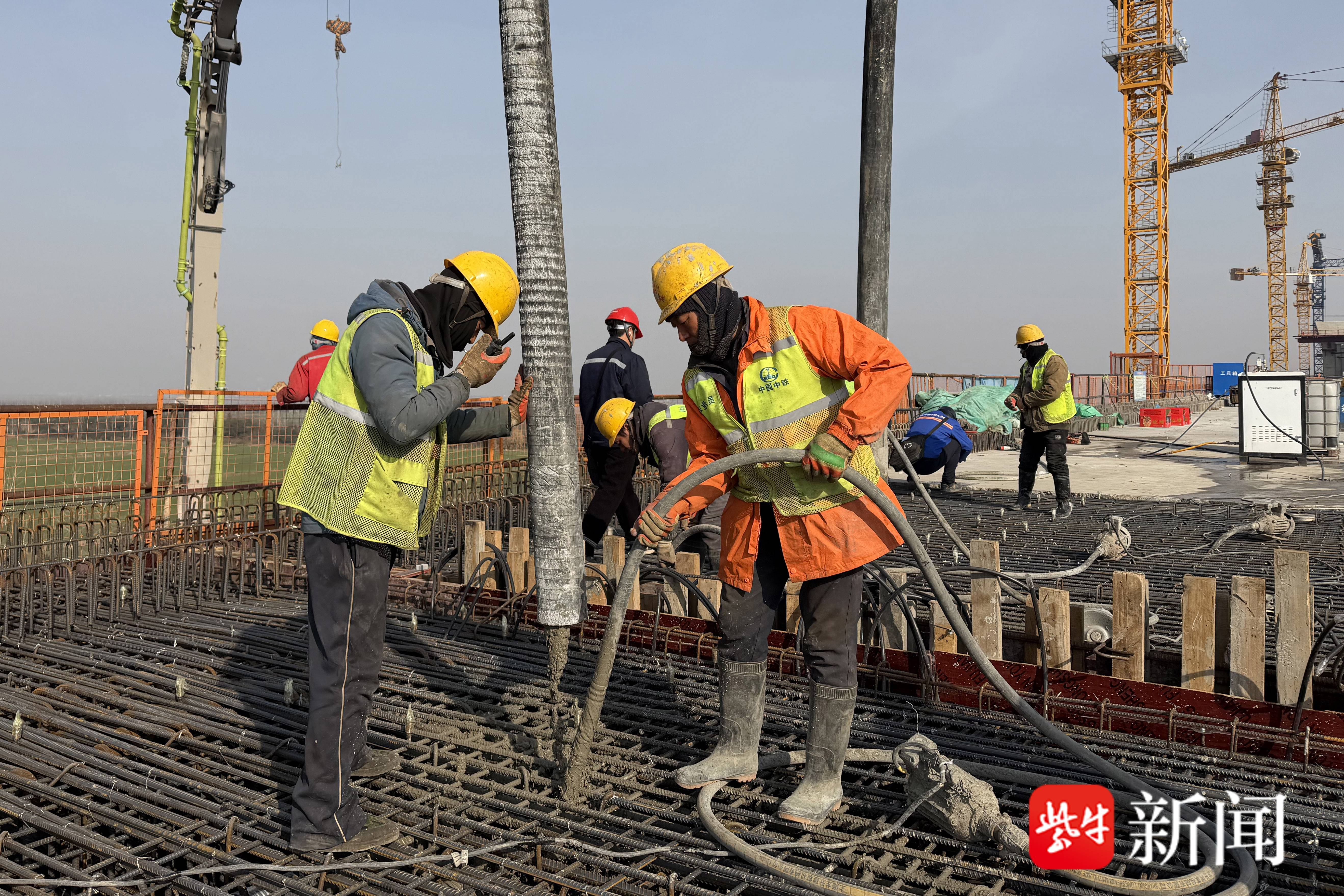 崇启公铁长江大桥南引桥位于江苏省启东市启隆镇境内,分别有跨长岛大道和跨南汊河两个连续梁。上层是高速公路,下层为高铁线、城际线,其中高铁线、城际线长均为830.05米,各五个桥墩、两套挂篮施工。此前跨南汊河城际线已浇筑完成,此次浇筑的是跨南汊河最后两个块段—高铁线S24-S28#墩2*64m T构连续梁。