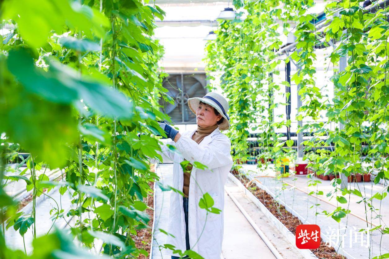 与此同时,在云台农场兴垦科技的现代智能玻璃温室大棚里,另一种特色经济作物正蓬勃生长——啤酒花。一株株啤酒花顺着吊蔓绳向上攀爬。这里采用了国内领先的无土栽培模式,以粗细椰糠为基质,配合空气源温控、漫散射玻璃、水肥一体化滴灌等先进技术,精准复刻并优化了啤酒花的理想生长环境。