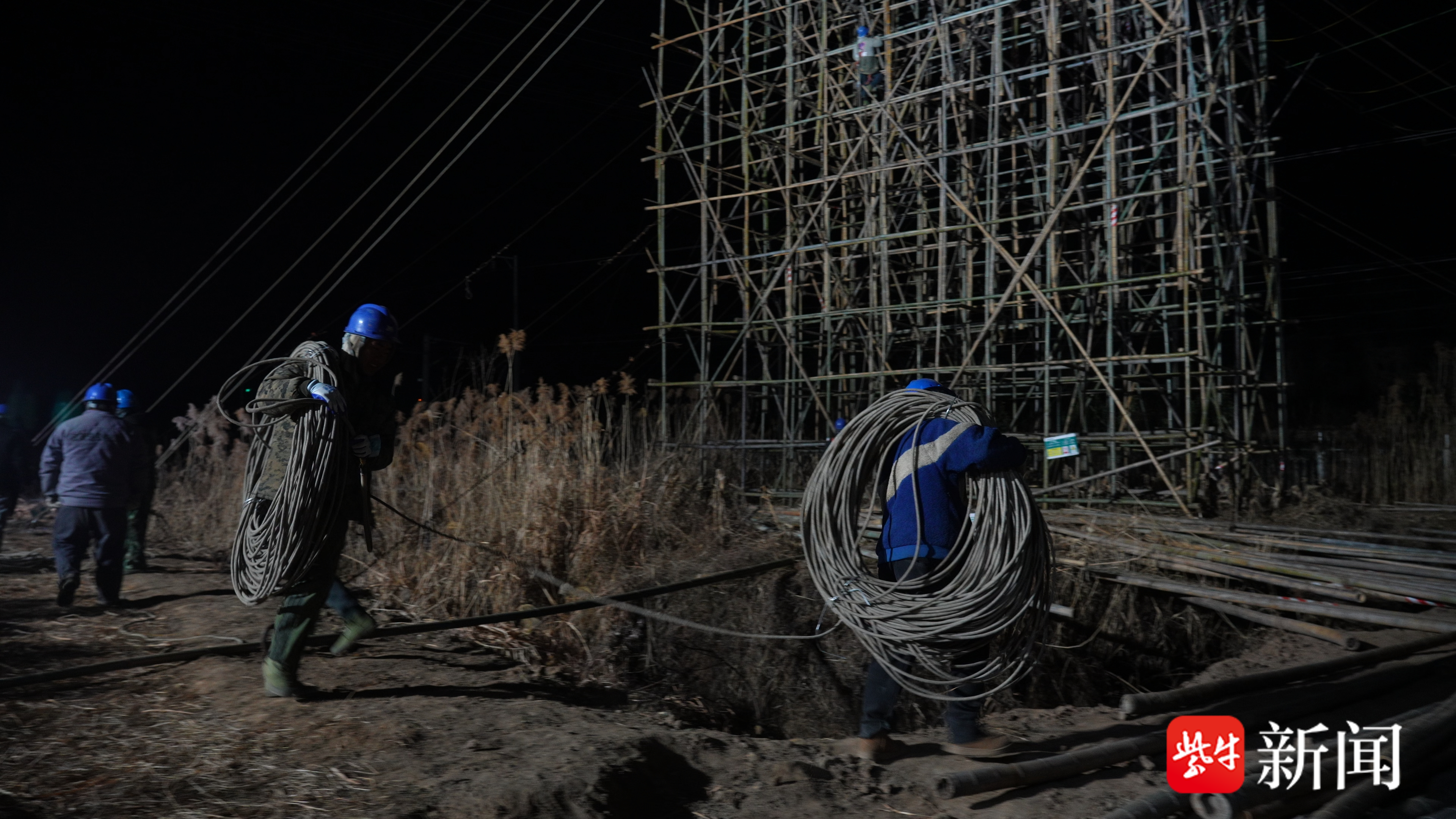 1月12日零点,国网镇江公司输电运检中心正利用高铁停运窗口期开展输电线路拆除施工