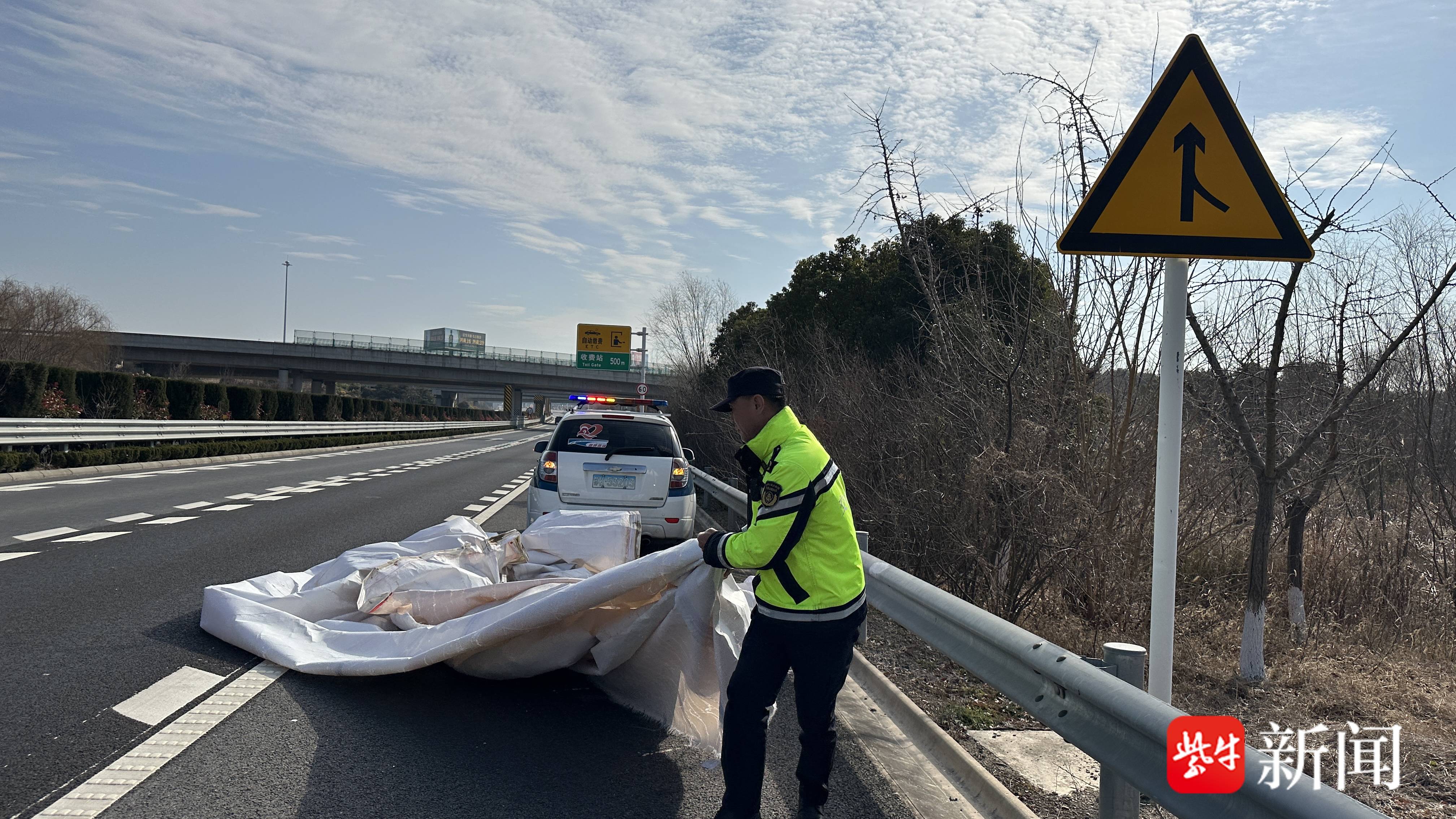 宁通支队第五大队执法人员立即启动应急处置预案,在事发路段来车方向规范设置警示标志,同时开启警灯和警报器,对现场交通实施临时疏导,引导过往车辆减速安全绕行。随后,2名执法人员借助随车工具开展清理作业,先将悬垂在路面的广告布小心剥离,再将重达数十斤的整块布体拖拽至应急车道,并细致捡拾散落的布片碎片。经过20余分钟的紧张作业,脱落广告布被彻底清理干净,高速道路恢复正常通行秩序。