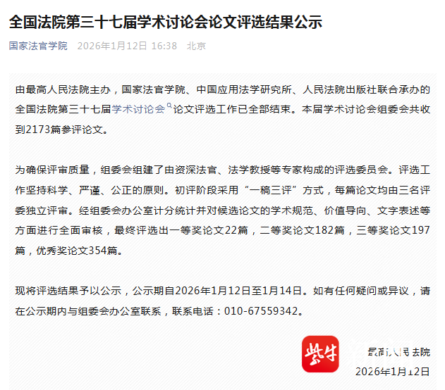 据悉,全国法院学术讨论会是全国法院系统参与人员最多、涉及领域最广、影响力最大的法官学术研究交流平台。本届学术讨论会,共有2173篇论文参评,组委会经过匿名评审、一稿三评、独立评审、同行评审、同题(类)择优等程序严格评审,最终确定获奖结果。