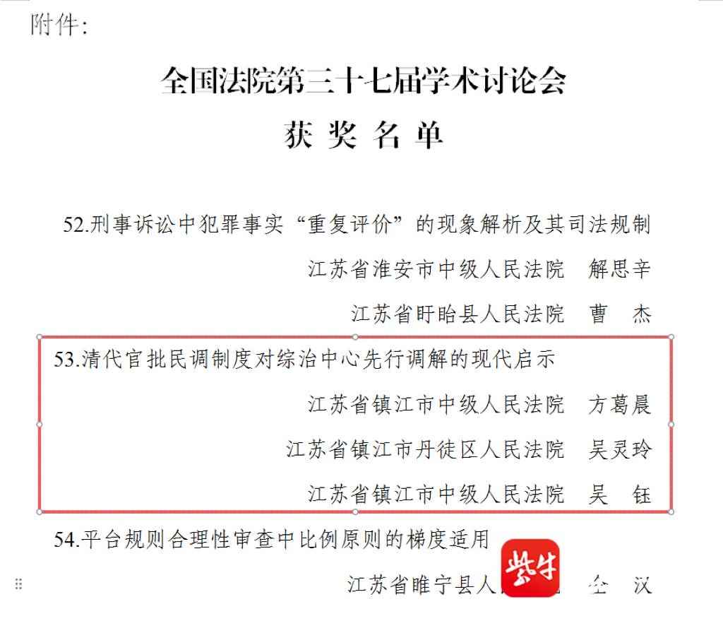 扬子晚报网1月15日讯(通讯员 陈怡 记者 万凌云 姜天圣)近日,由最高人民法院主办,国家法官学院、中国应用法学研究所、人民法院出版社联合承办的全国法院第三十七届学术讨论会论文评选结果公示,镇江丹徒法院干警吴灵玲参与撰写的《清代官批民调制度对综治中心先行调解的现代启示》获评全国法院第三十七届学术讨论会论文二等奖。