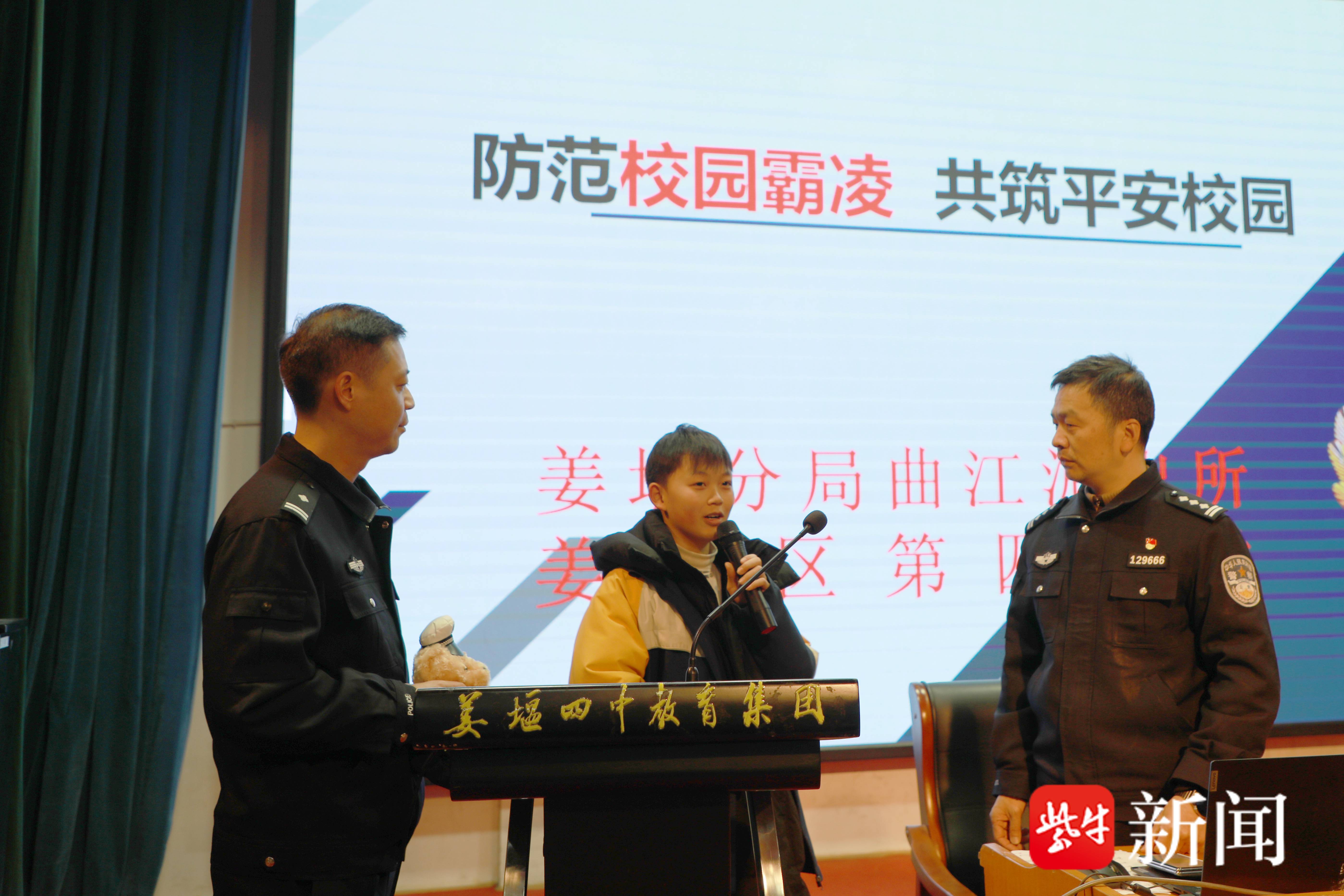 扬子晚报网1月16日讯 (通讯员 袁泽宇 记者王国柱)为筑牢校园安全防线,增强学生法治意识与自我保护能力,近日,泰州市公安局姜堰分局曲江派出所发挥“派出所主防”作用,组织民警走进姜堰区第四中学开展“防范校园霸凌 共筑平安校园”专题法治宣讲活动,以警校携手之力为青少年成长护航。