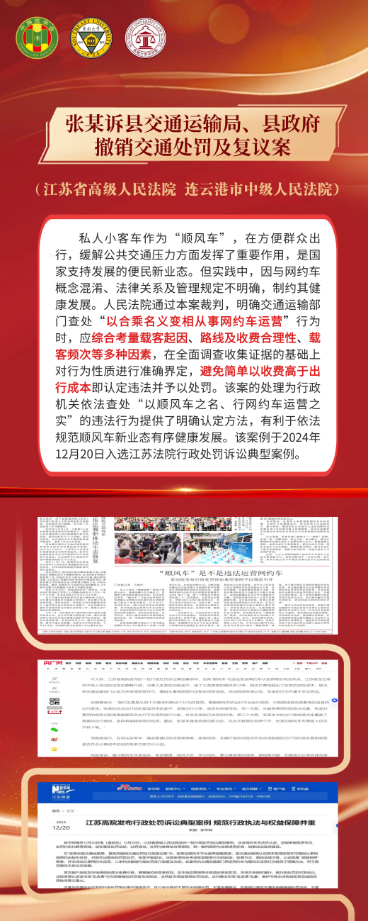 在引发广泛关注的“张某诉某县交通运输局、县政府撤销交通处罚及复议案”中,法院的裁判为厘清“顺风车”与“非法营运”提供了明确标准。判决指出,行政机关在查处涉嫌非法营运行为时,应综合考量出行目的、路线契合度、行为频率及收费合理性等实质要素,避免仅因收费即简单定性。该案例于2024年12月已先行入选江苏法院行政处罚诉讼典型案例。