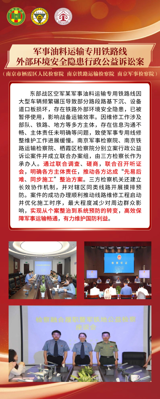 在一起涉及事故后逃逸的非机动车交通事故案中,判决界定了行政违法与民事可责的边界,明确未将“逃逸”这一行政违法行为简单等同于保险条款中的“故意”,对规范格式条款解释、保障从业者权益具有示范意义。“军事油料运输专用铁路线外部环境安全隐患行政公益诉讼案”则通过军、铁、地检察机关融合履职,破解了涉军交通专线的多年安全治理困境。