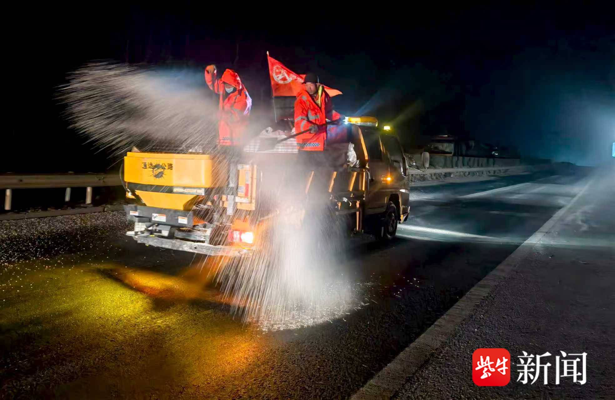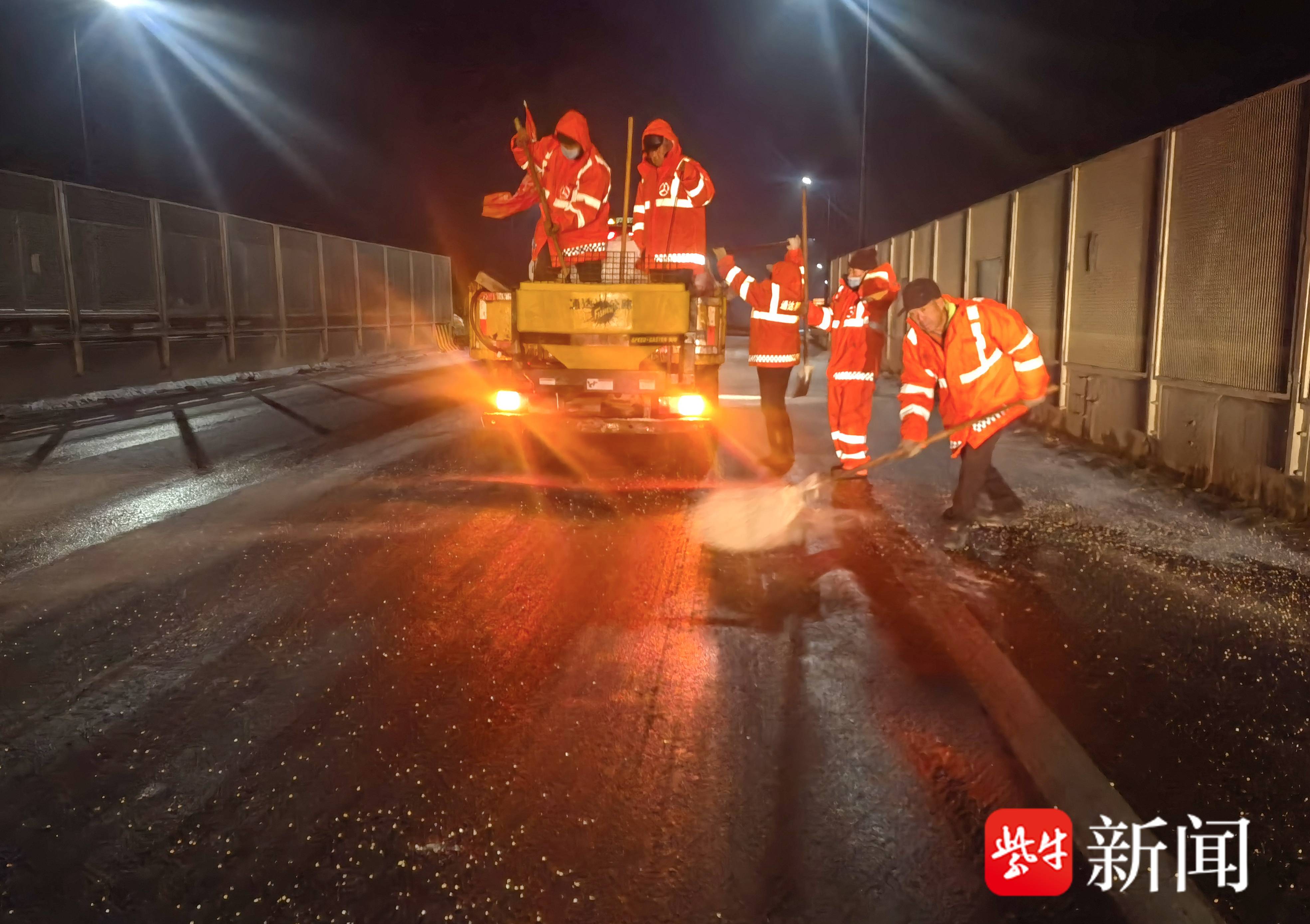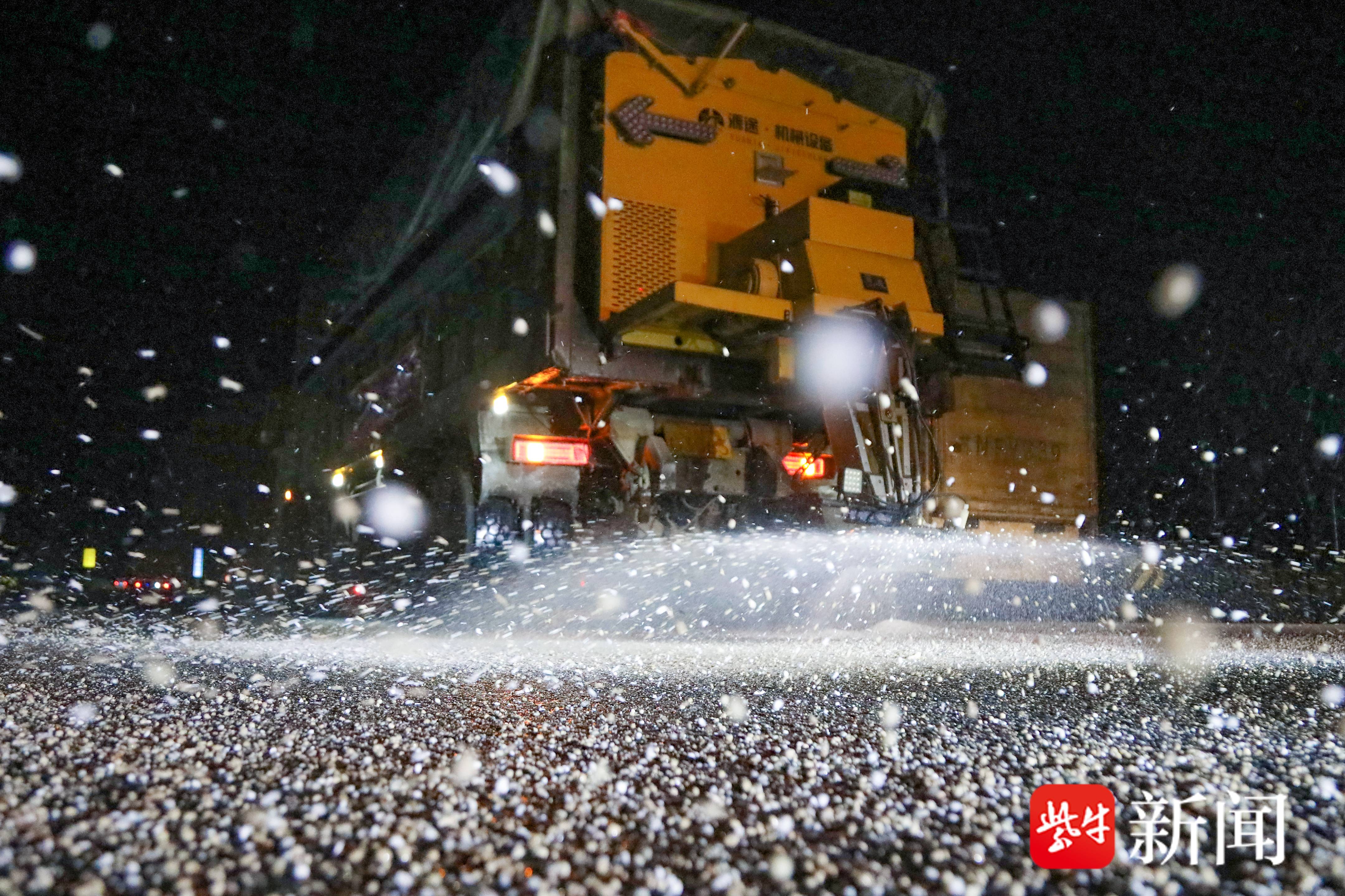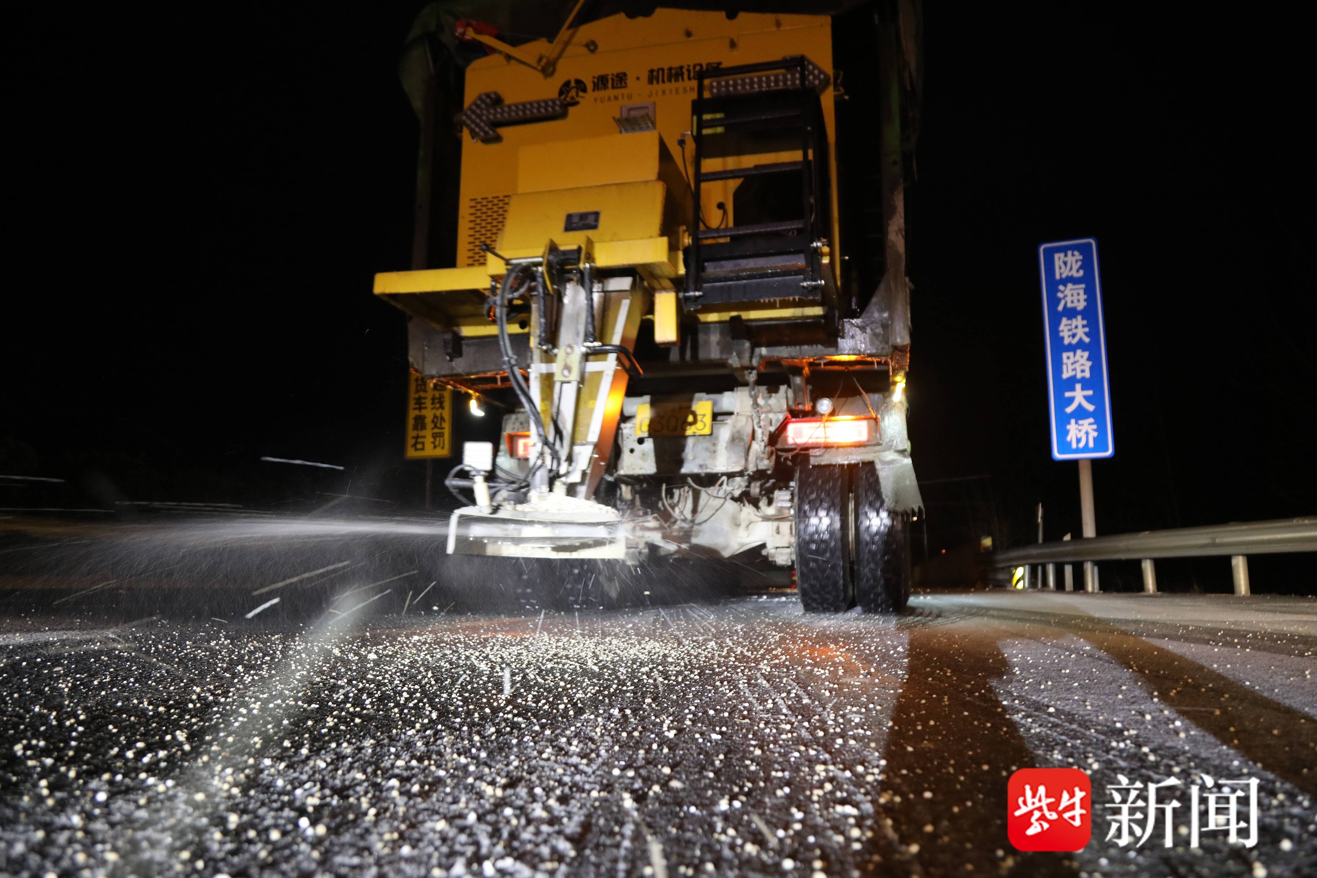 1月18日夜,连云港市东海县出现大范围降雪天气,路面结冰影响交通,东海县公路事业发展中心迅速出动机械和人员,连夜在重要交通要道从撒布融雪剂、防滑料,确保市民安全出行。