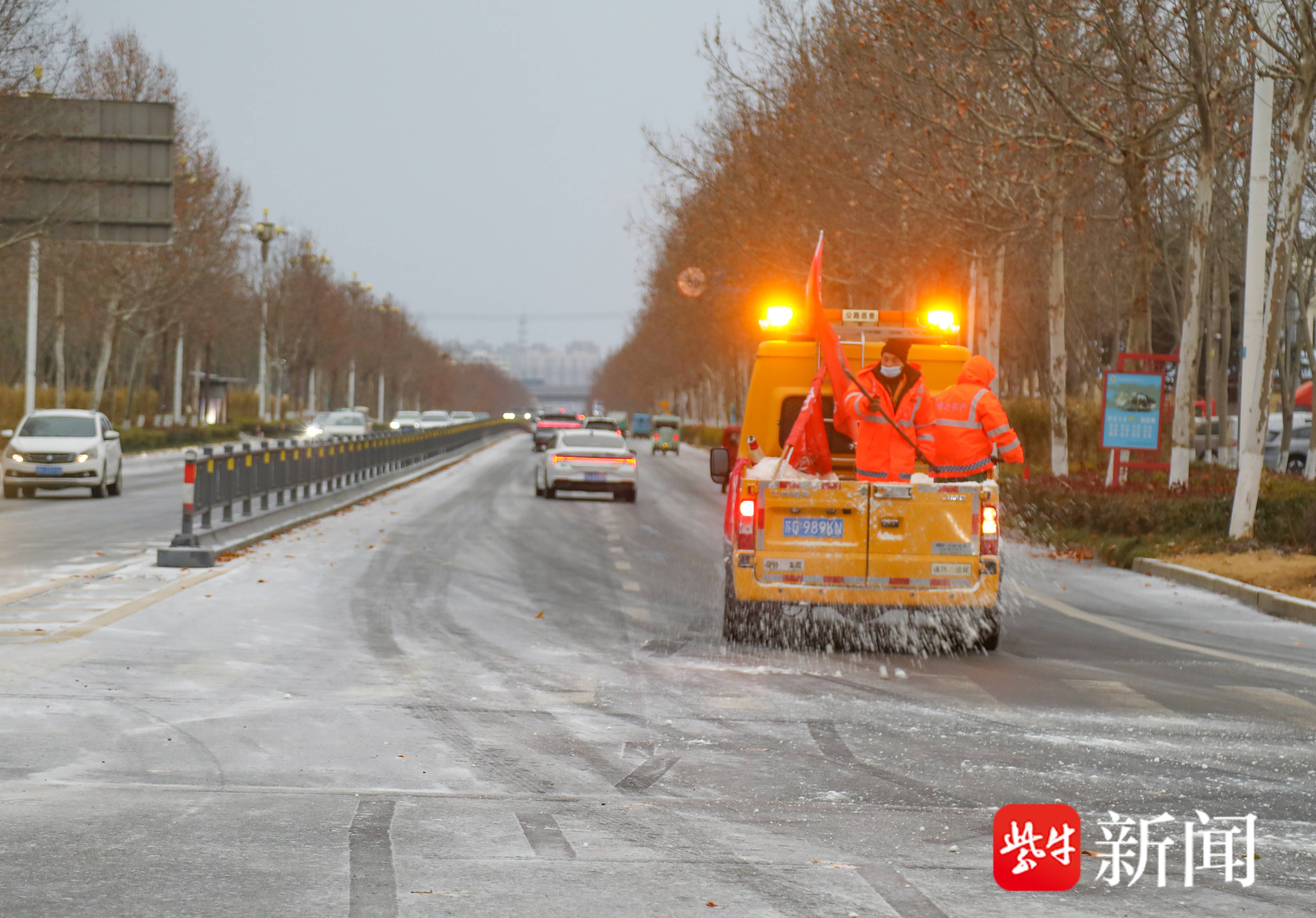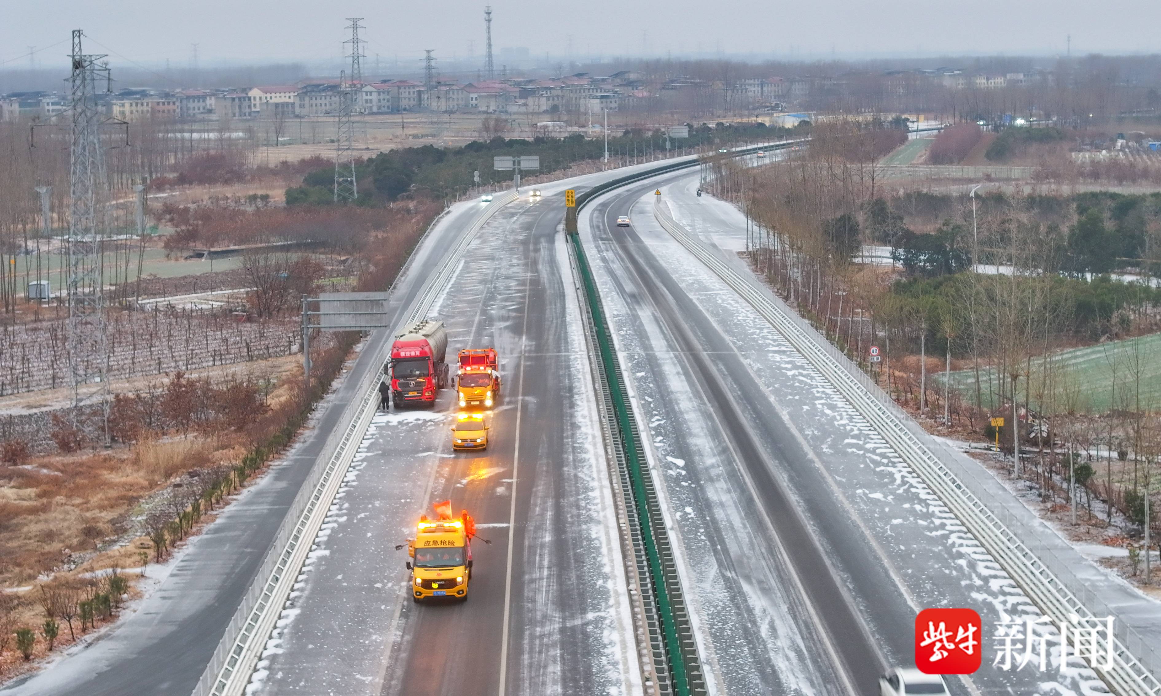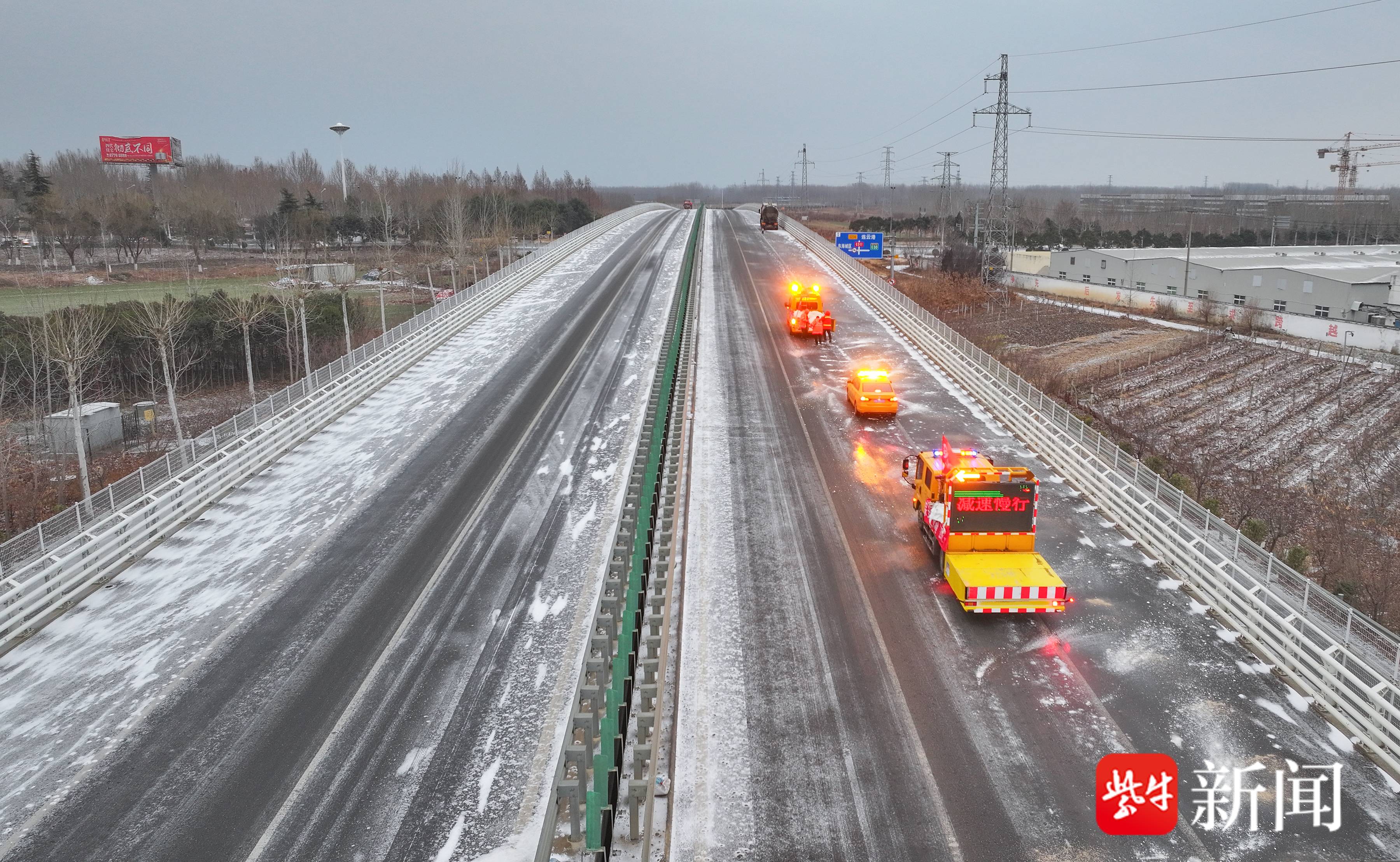 连云港东海县出现大范围降雪,公路部门已撒布融雪剂50吨