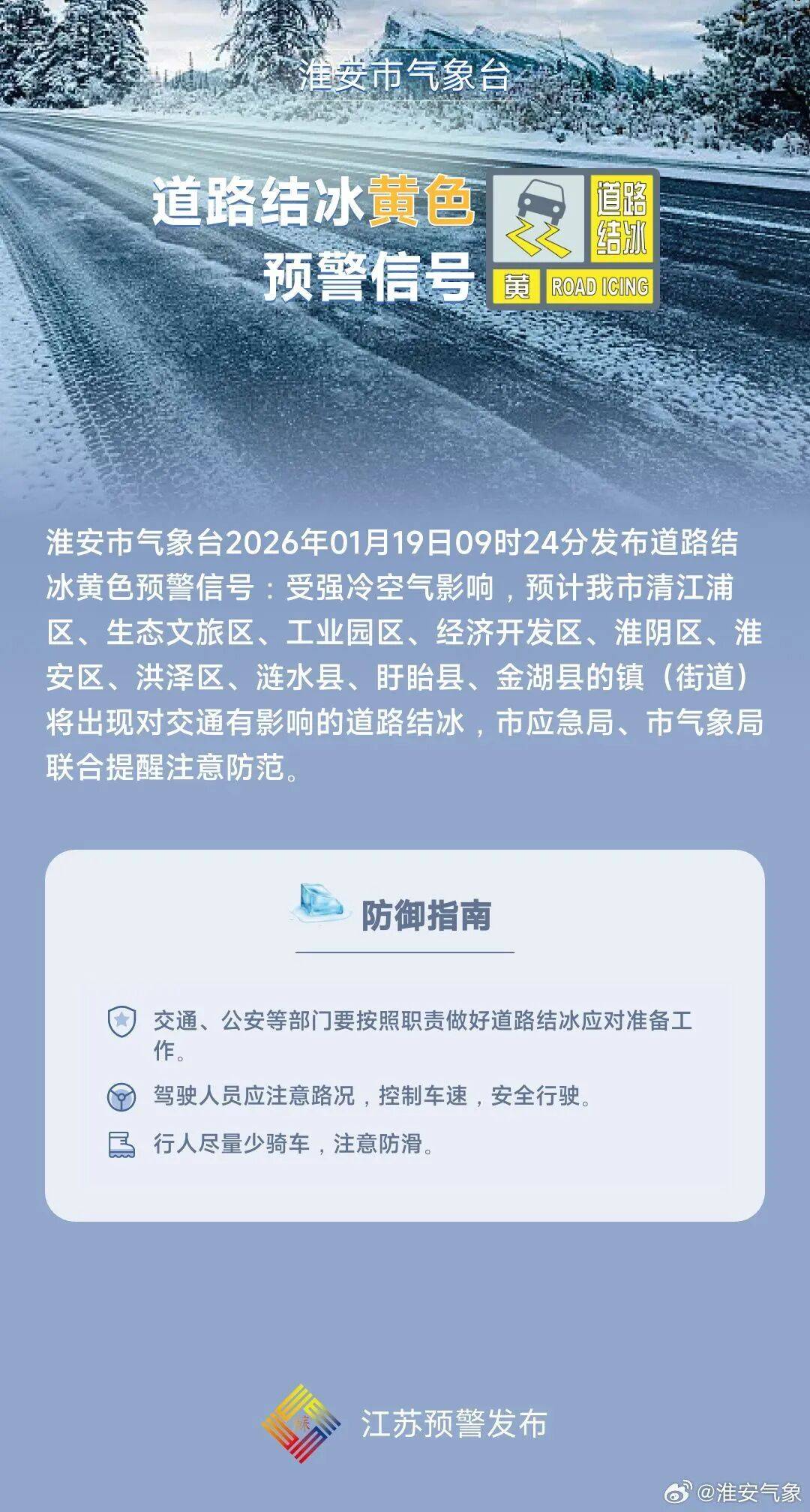 刚刚,淮安市气象台发布道路结冰黄色预警信号!
