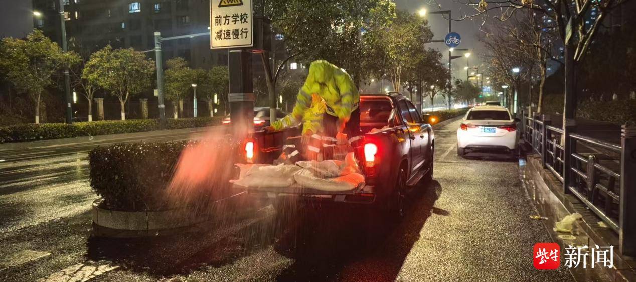 风雪就是命令,防控就是责任。降雪伊始,南城街道第一时间集结城管队员、社区志愿者等40余人,调配2台应急车辆奔赴一线。夜色沉沉中,身披荧光黄的城管队员手持铁锹、融雪铲,在主次干道、学校周边、小区出入口等重点路段不停奋战;志愿者们紧随其后,扬洒的白色融雪剂在路灯下划出优美弧线,与路面积冰快速反应,高效破除坚冰障碍,用深夜里的忙碌身影,守护着雨夜归家群众的平安路。