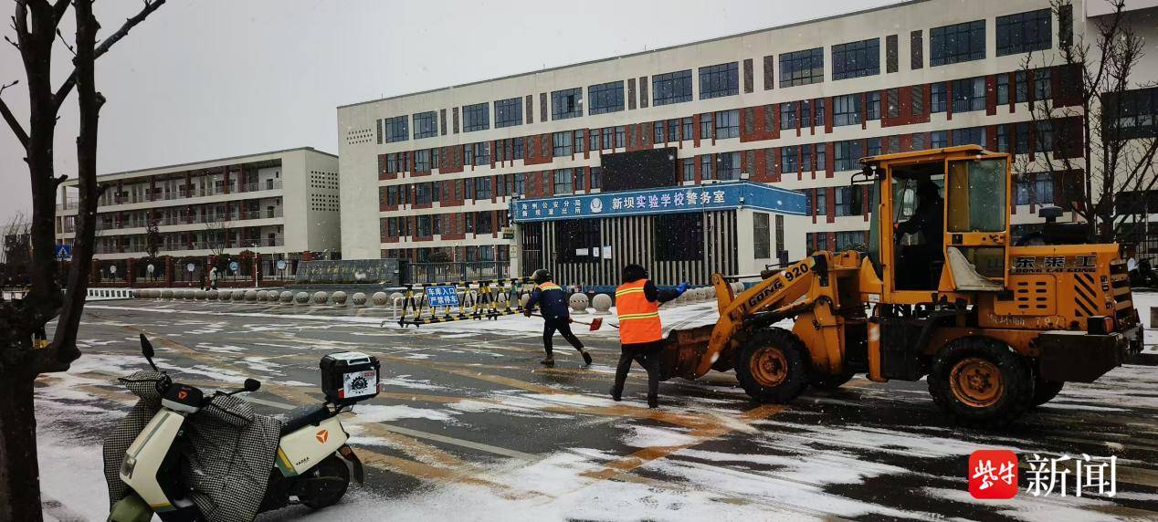 聚焦重点群体,温情守护上学路。新坝镇将保障师生出行安全放在首位,迅速组织5名工作人员,调配除雪机,针对新坝小学周边主干道及校园出入口开展融雪剂布撒作业,作业覆盖道路总长度约2.3公里。作业中,队员们细心发现校门口无障碍通道有薄冰,特意多撒了两遍融雪剂,用细致入微的行动确保孩子们入校时脚下安稳。凛冽寒风里,橙色反光背心与飘扬的雪花相映成趣,成为冬日校园旁最暖的风景。